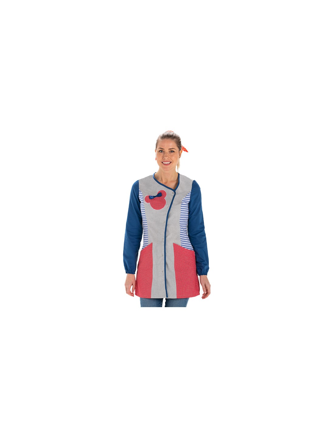 Bata de maestra de manga larga gris perla combinado con azul en las mangas y rojo en los bolsillos. Detalle patchwork de cabeza minie en el pecho. 2 bolsillos delanteros. Cierre con botones a presión delanteros. Cuello asimétrico. Aberturas en los laterales y elástico en los puños. 100% Algodón. Muy suave y cómoda. (Disponible de la XS a la XXXL)