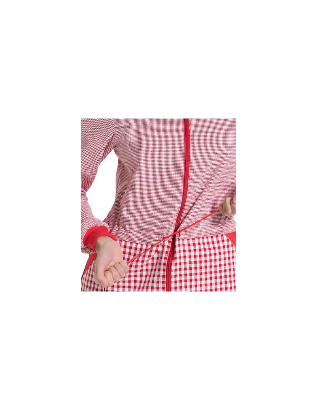 Bata para maestra en vichy de color rojo. Cuello chimenea. Cintas de ajuste en la parte delantera de la cintura. Manga larga con puño de canalé. Cierre mediante cremallera delantera de doble carro. Dos bolsillo delanteros