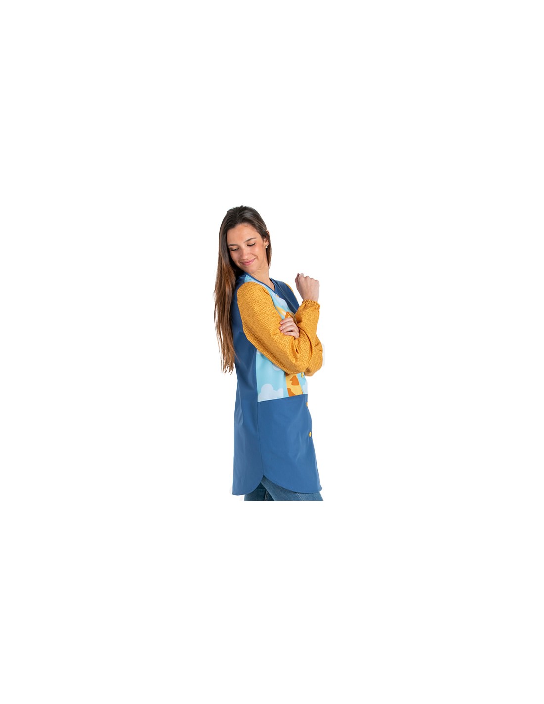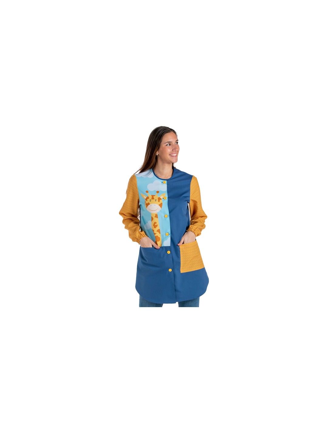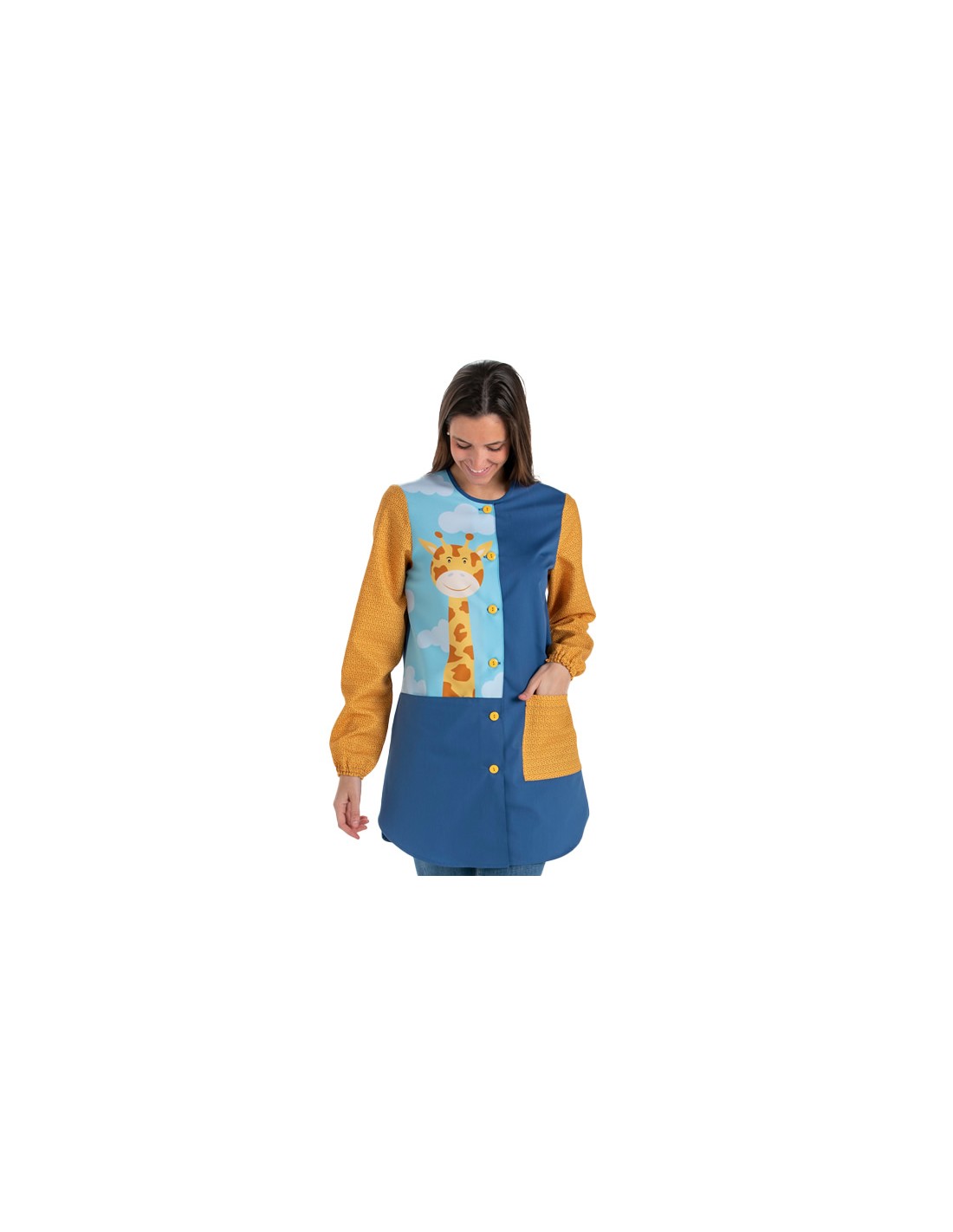 Bata para maestra azul con gracioso estampado de jirafa en zona pechera derecha. Manga larga con goma en los puños. Dos amplios bolsillos. Cierre mediante botones de color albero a contraste. Cuello redondo. Largo aproximado 82 cm. Disponible desde la talla XS a la talla 3XL