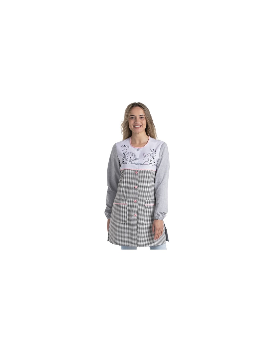 Bata de maestra vichy color gris con detalles rosa a contraste. Gracioso estampado en canesú de animales zoo. Manga larga con goma en los puños y cuello redondo. Aberturas laterales. Dos amplios bolsillos. Disponible de la XS a la 3XL.
