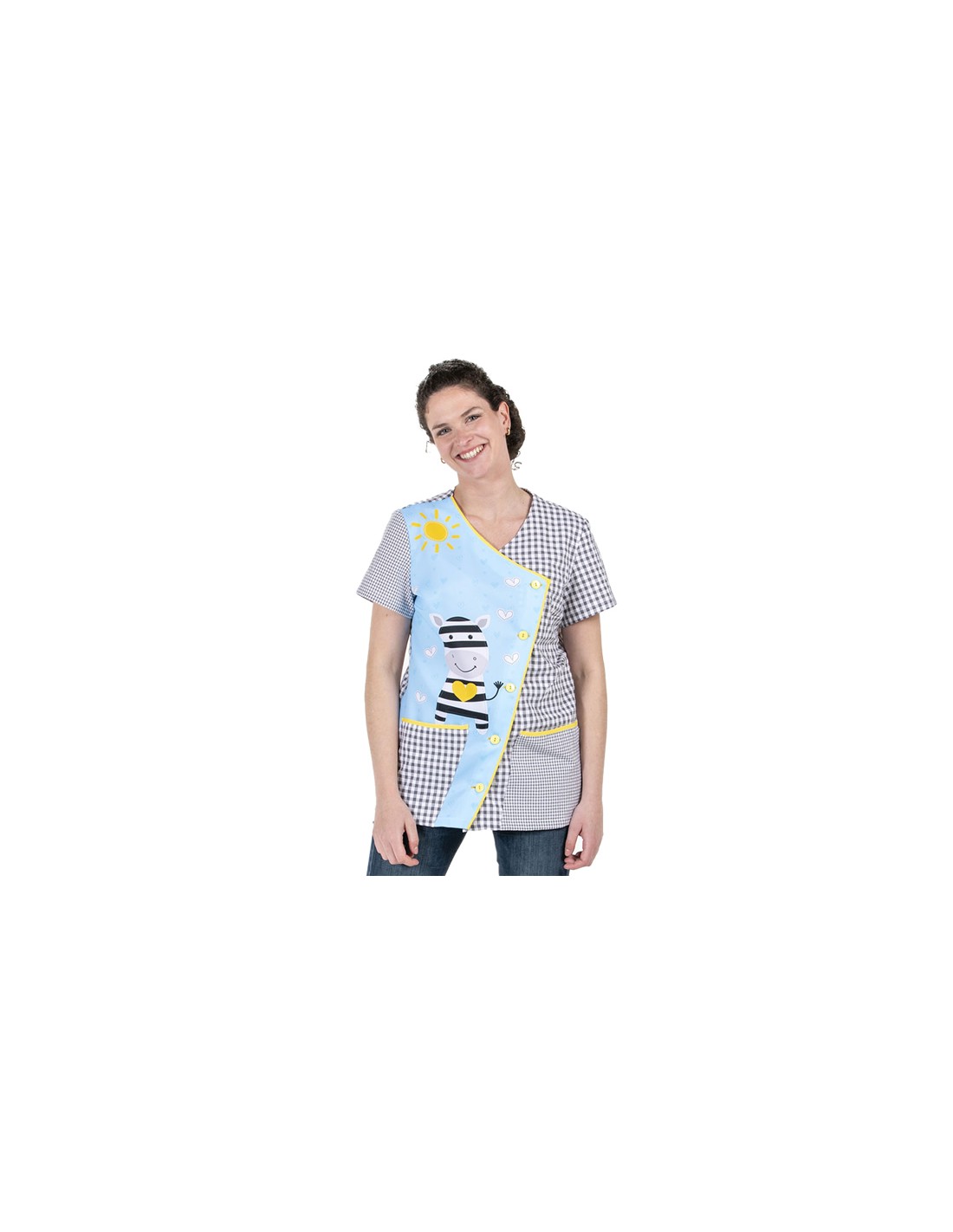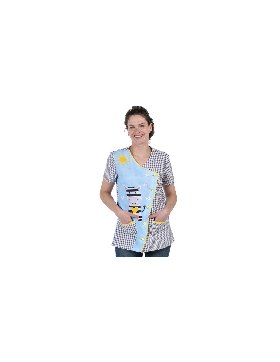 Bata de manga corta para maestra confeccionado con tejido vichy de color gris en combinación de tamaño de cuadros en bolsillo izquierdo y manga derecha. Gracioso estampado de cebra en lateral delantero derecho. Cierre asimétrico mediante botones y bies de color amarillo a contraste. Tejido rico en algodón, muy suave y cómodo.