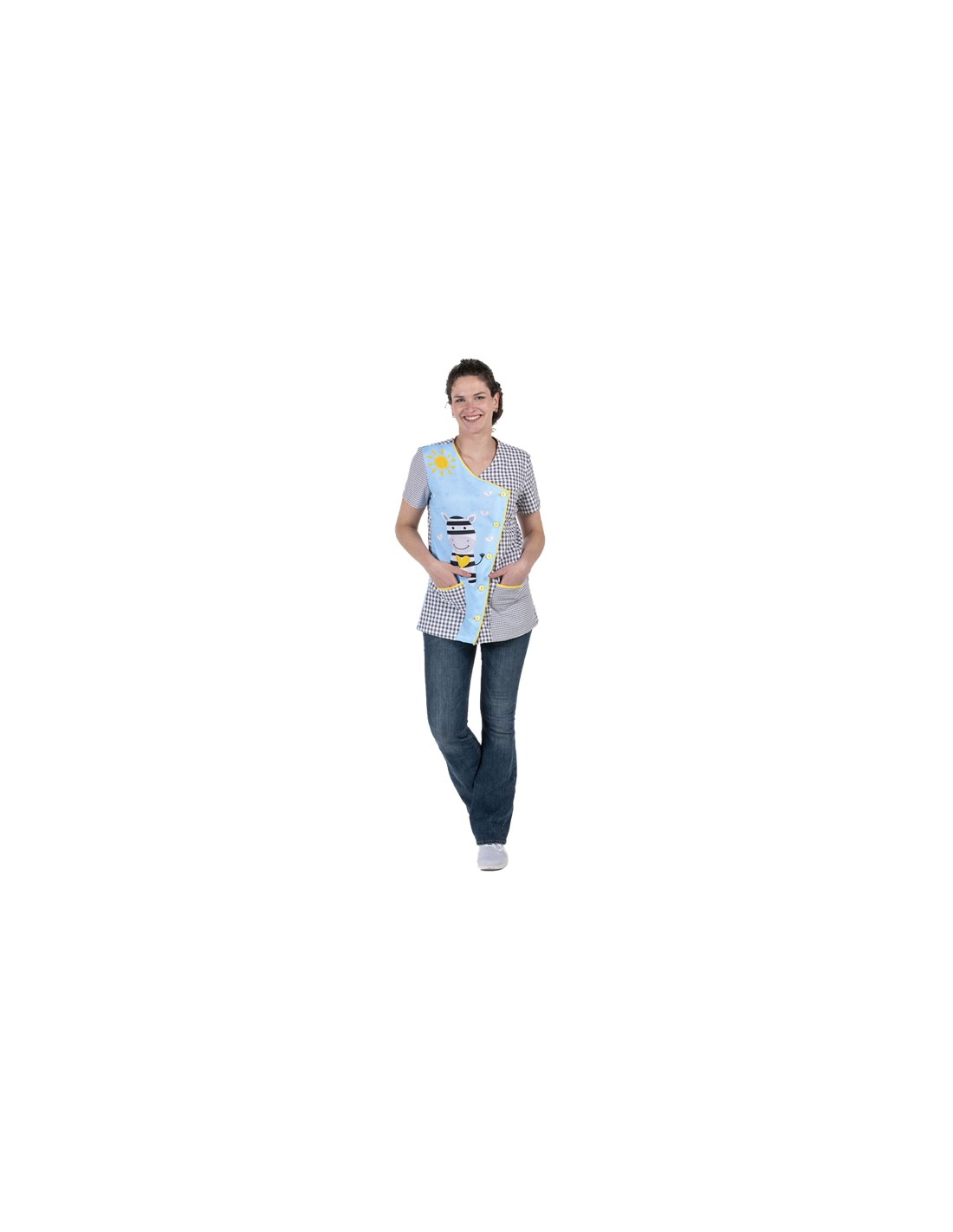 Bata para maestra en manga corta confeccionada en tejido vichy de color gris. Estampado de graciosa cebra en lateral delantero derecho. Cierre asimétrico mediante botones y bies de color amarillo a contraste.