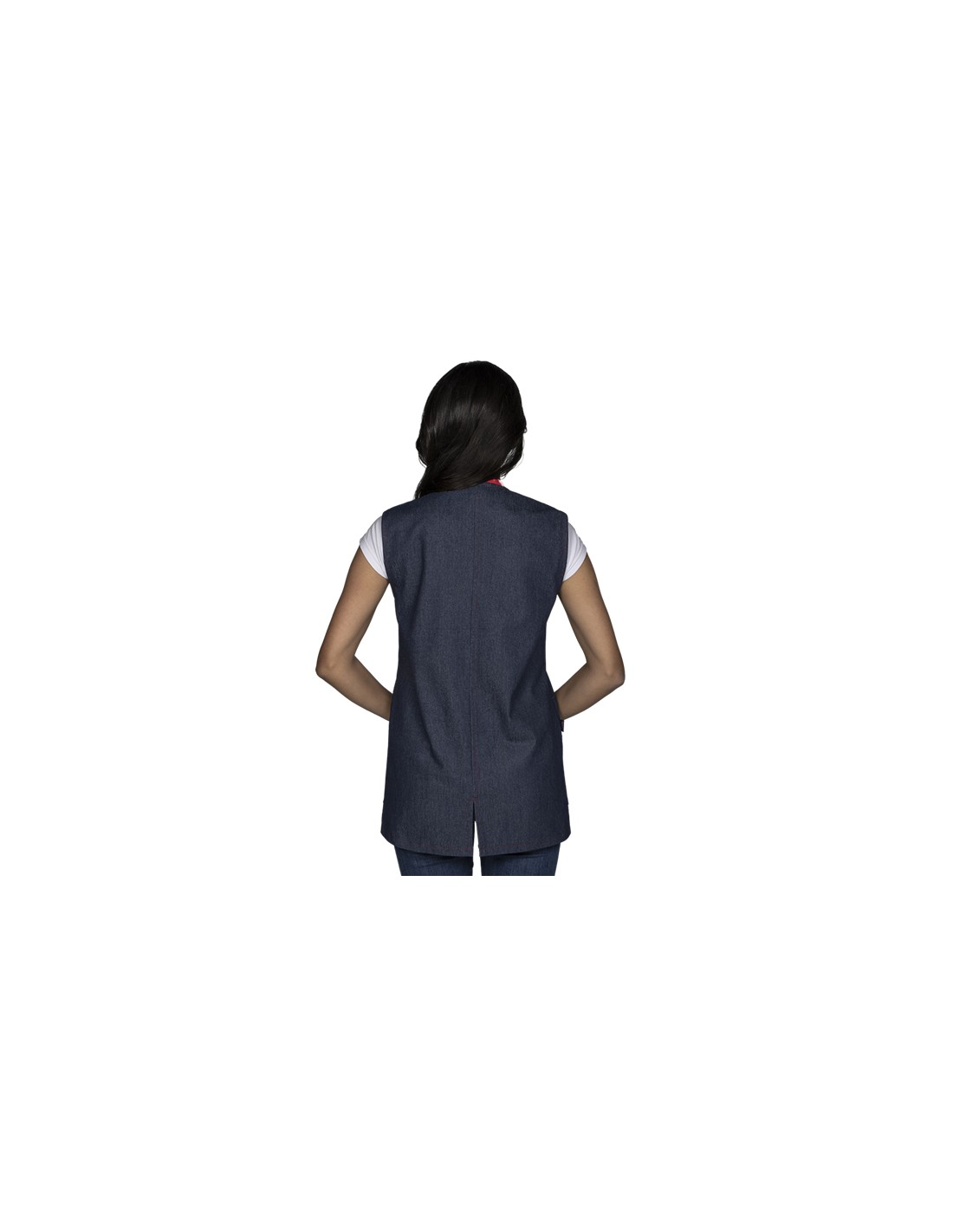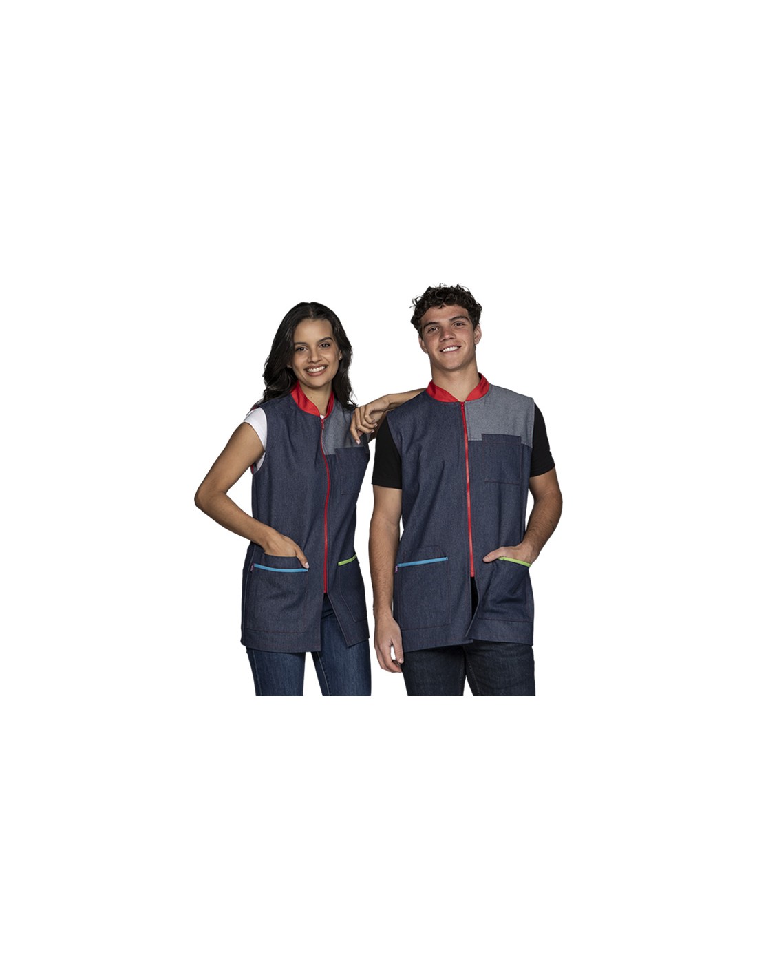 Chaleco denim unisex con cuello semi redondo en color rojo a juego con la cremallera central. Tres bolsillos, dos amplios en cadera con vivo color pistacho y color rojo y tercer bolsillo superior en pecho izquierdo sin vivo. Abertura en la espalda baja para mayor comodidad y libertad de movimientos. Tejido muy agradable al tacto. Disponible desde la talla XS a la talla 3XL.