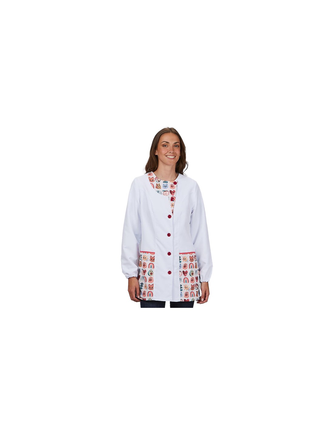 Bata de manga larga de color blanco con estampado de animales de colores en bolsillos y medio cuello. Cuello redondo y cierre asimétrico, botones de color granate. Aperturas laterales y pinzas en pecho y espalda para mayor ajuste, holgura y comodidad. Confeccionada con tejido microfibra reciclada de fácil lavado y secado. No necesita planchado. Composición 54% Poliéster reciclado y 46% Poliéster. Disponible desde la talla XS a la talla XXL.
