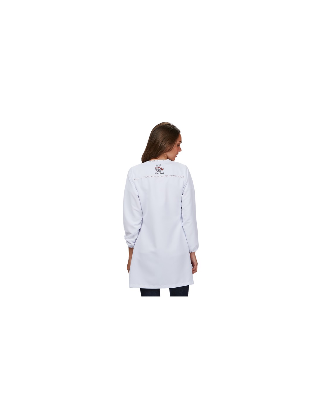 Bata de manga larga de color blanco con los vivos delanteros y traseros estampados, bolsillos delanteros y canesú estampados con divertidos buhitos. Cuello redondo acabado en V. Cierre con cremallera de doble carro para mayor comodidad al sentarte pudiendo abrir en ambos sentidos. Pinzas en pecho y espalda para mayor ajuste y comodidad.. Confeccionada con tejido microfibra reciclada de fácil lavado y secado, No necesita planchado. Composición 54% Poliéster reciclado y 46% Poliéster. Disponible desde la talla XS a la talla XXL