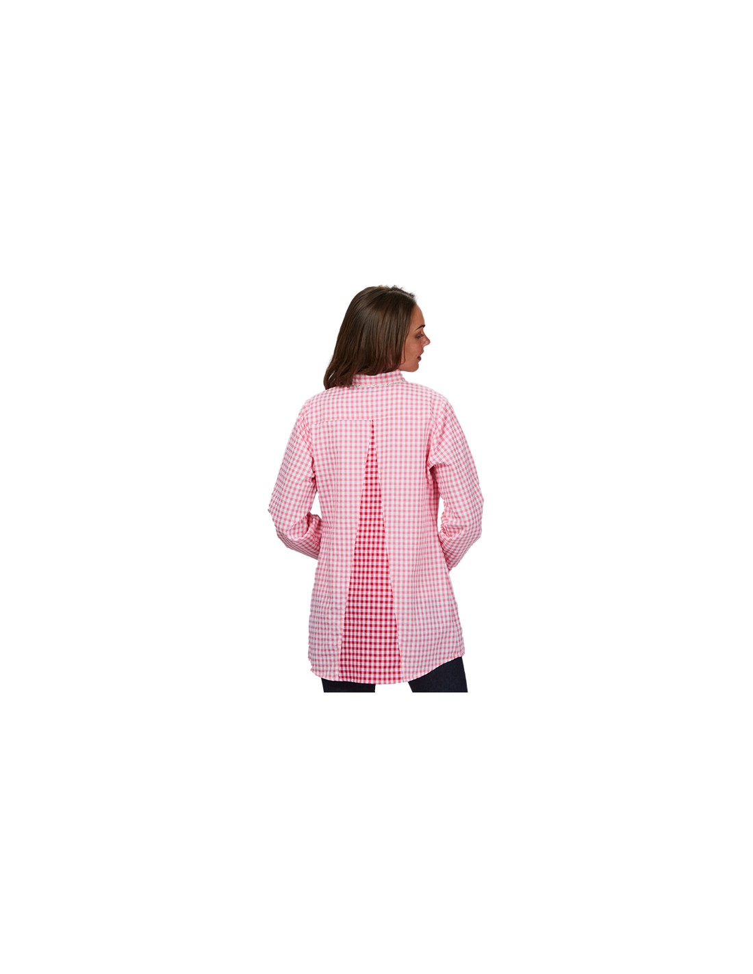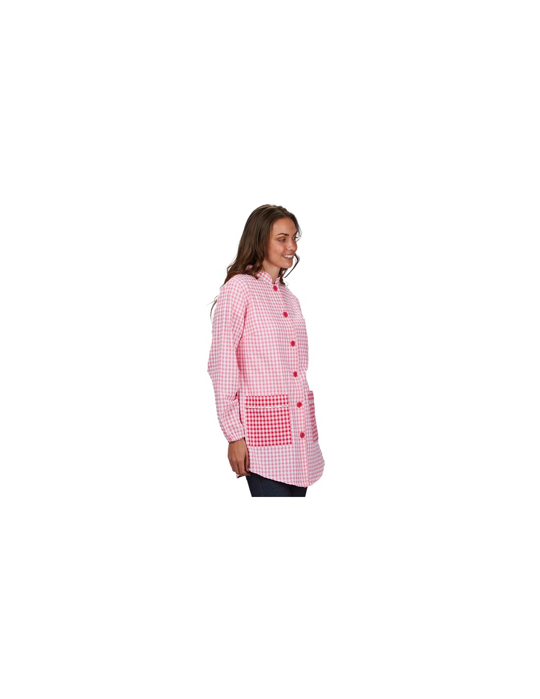 Bata de manga larga confeccionada en tejido Vichy de cuadros rosas y blancos, botonera central de grandes botones de color Fucsia a juego con los bolsillos a la altura de la cadera con el vivo estampado. Fuelle en la espalda de color fucsia que aporta comodidad y mayor movilidad. Cuello Mao con ribete estampado a juego con el vivo de los bolsillos.