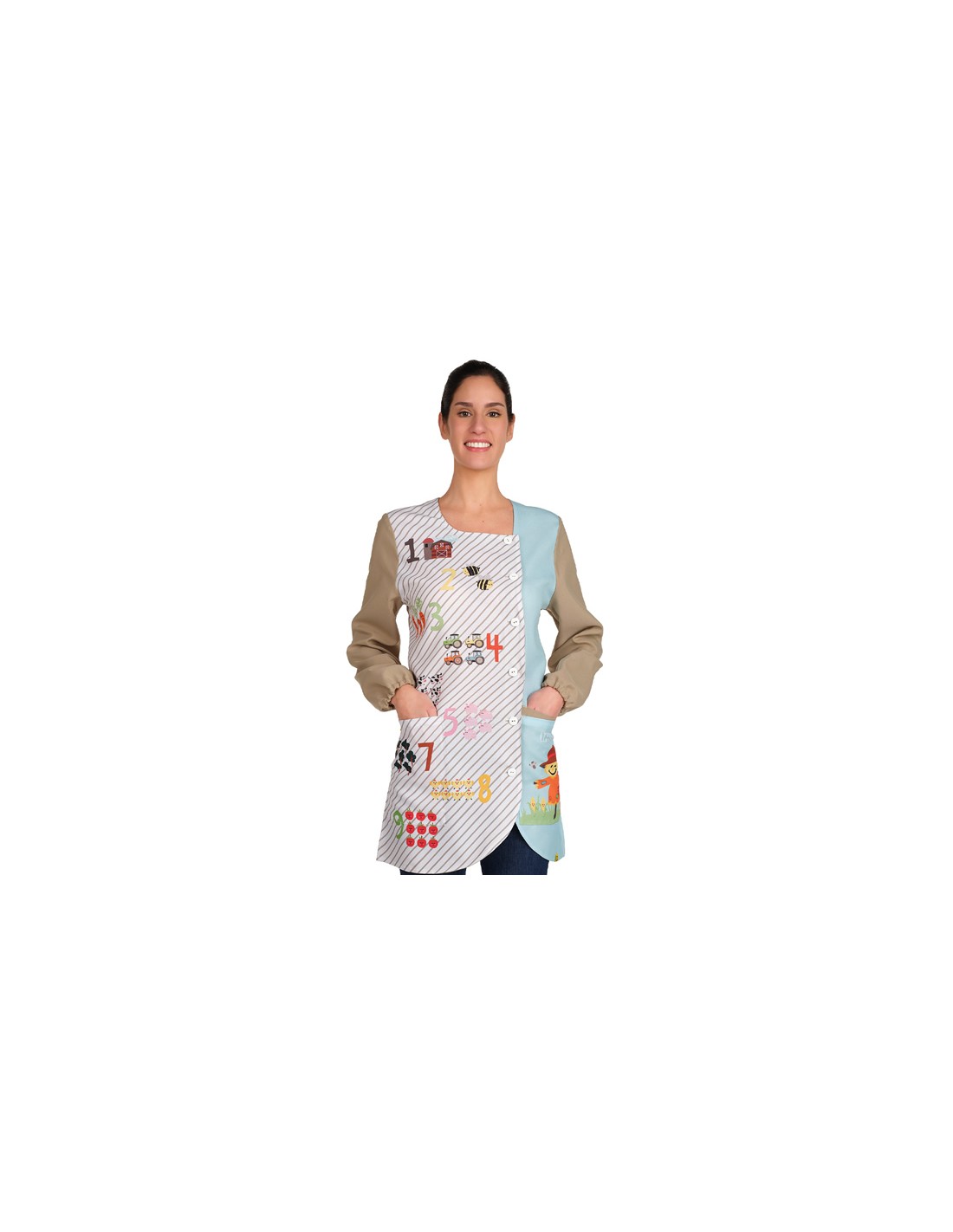 Bata de maestra en color beige con original estampado de temática granja con números, animales y tractores. Escote redondo ligeramente asimétrico y cierre delantero lateral mediante botones blancos. Manga larga en beige liso con goma en los puños. Dos amplios bolsillos, uno de ellos con interior. Pinzas y cintas de ajuste en la espalda para mayor adaptabilidad. Disponible desde la talla XS hasta la 5XL.