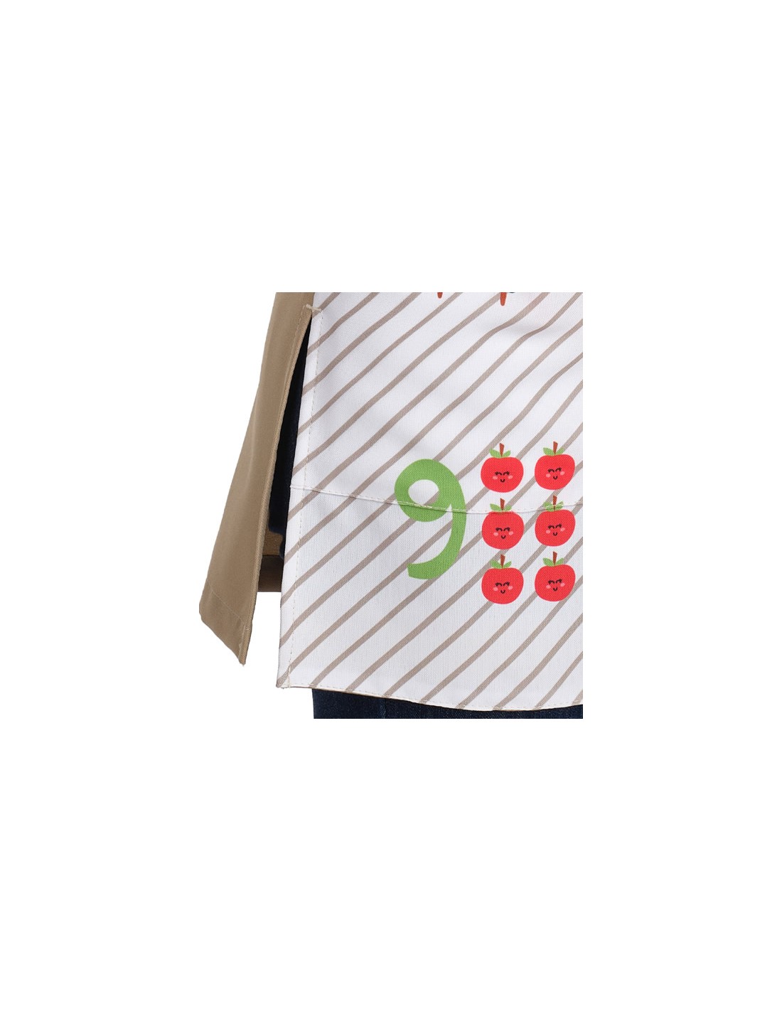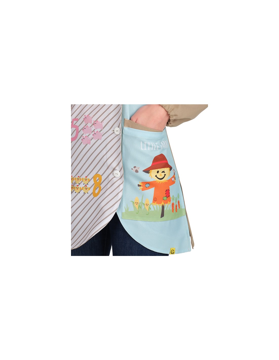 No se olvide de guardar su personalización antes de añadir a la cestaBata para profesora en color beige con original estampado de temática granja con números, animales y tractores, ideal para el aula. Presenta escote redondo y cierre delantero lateral con botones blancos. Combina mangas en beige liso con goma en los puños, panel estampado de rayas beige y pieza lateral azul con bolsillo decorado con un espantapájaros. Dispone de amplios bolsillos delanteros y pinzas con cintas de ajuste en la espalda para mayor comodidad y funcionalidad.