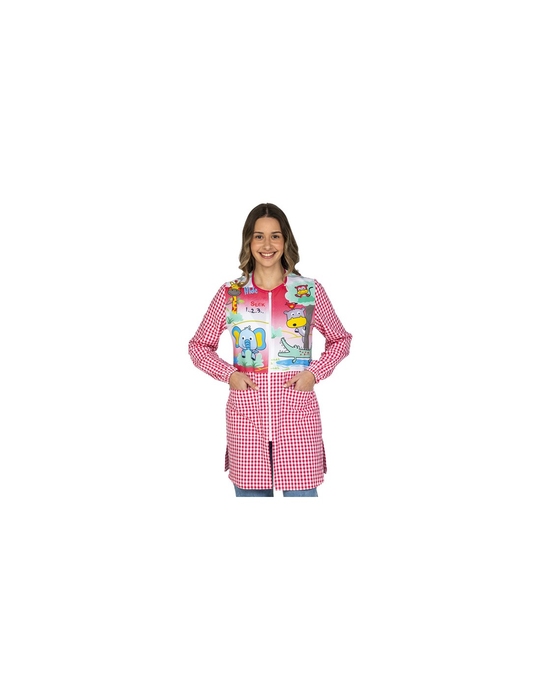 Bata de maestra en tejido vichy rojo rico en algodón con la parte superior estampada de animales tipo safari. Cierre mediante cremallera central y cuenta con dos bolsillos. Diseño con pinzas en espalda, pequeñas aberturas laterales y puños con goma para mayor comodidad y funcionalidad. Disponible en tallas de la XS-3XL. Largo: 84cm.