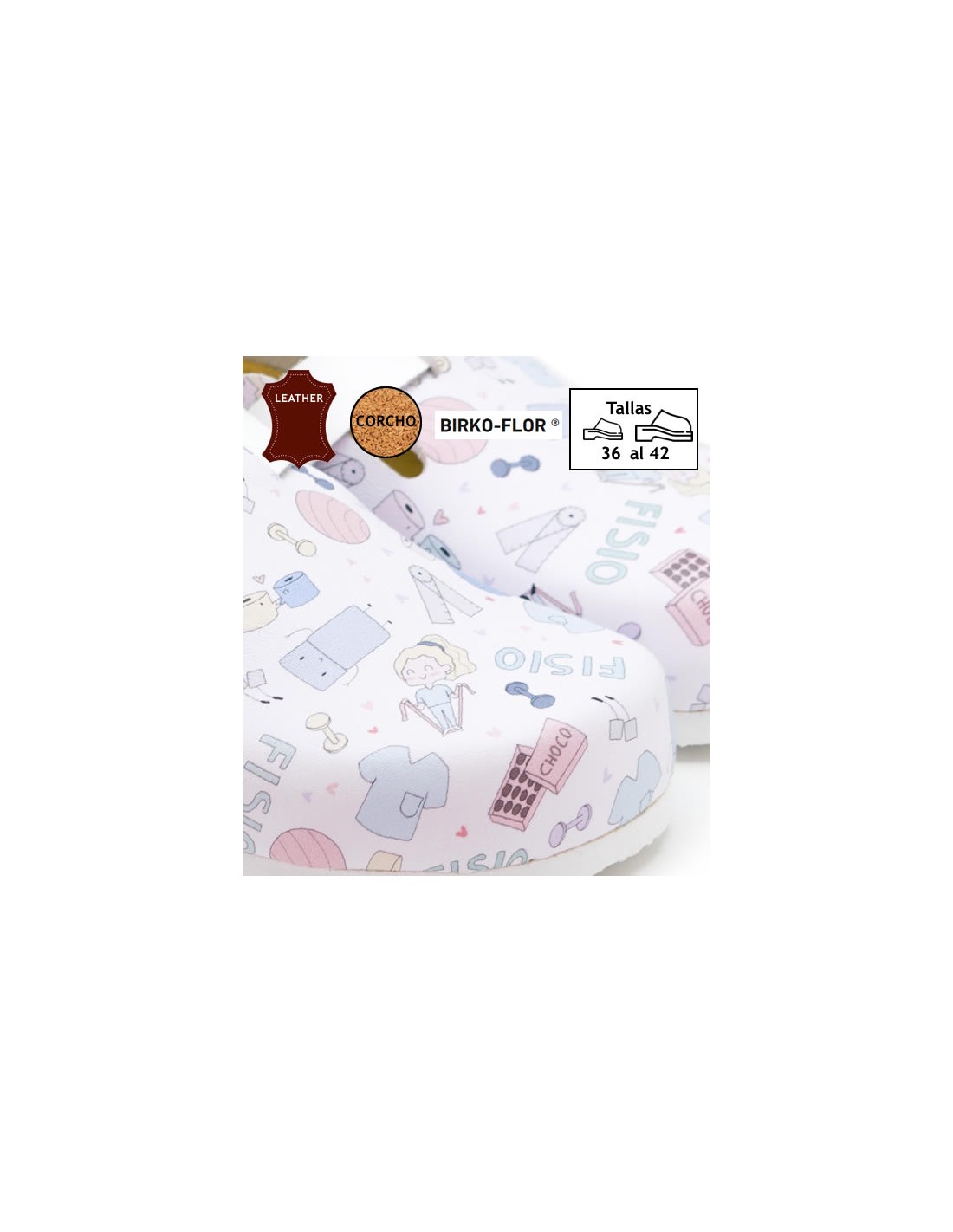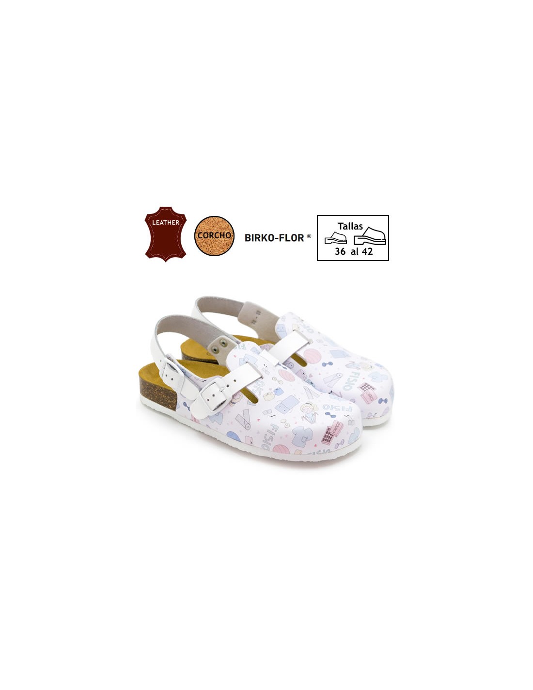 Zueco unisex, anatómico con estampado de dibujos de material de fisioterapia. Planta de corcho natural forrada de cuero. Empeine ajustable y correa de talón que se adapta a todo tipo de pie. Muy ligeros y cómodos. Disponibles desde la talla 36 a la 42.