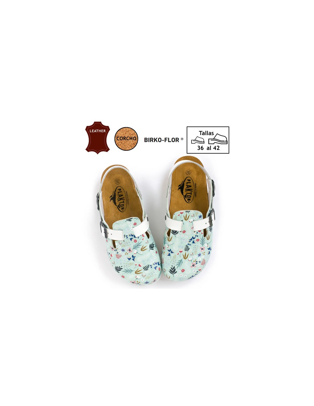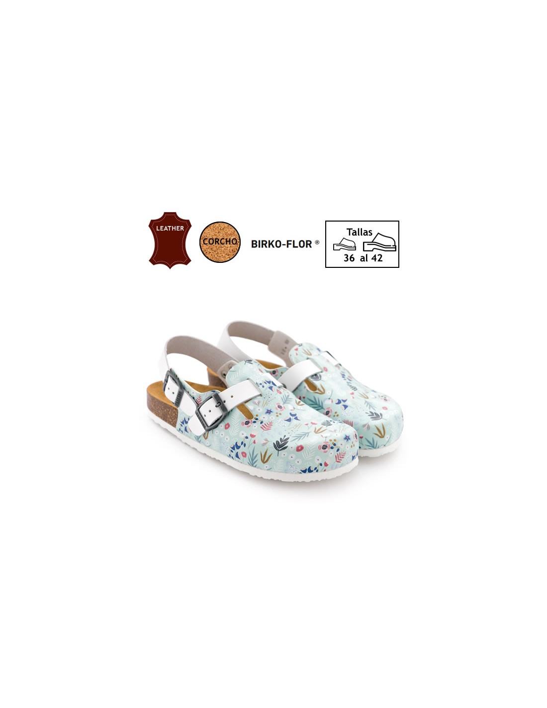 Zueco unisex, anatómico con estampado floral. Planta de corcho natural forrada de cuero. Empeine ajustable y correa de talón que se adapta a todo tipo de pie. Muy ligeros y cómodos. Disponibles desde la talla 36 a la 41.