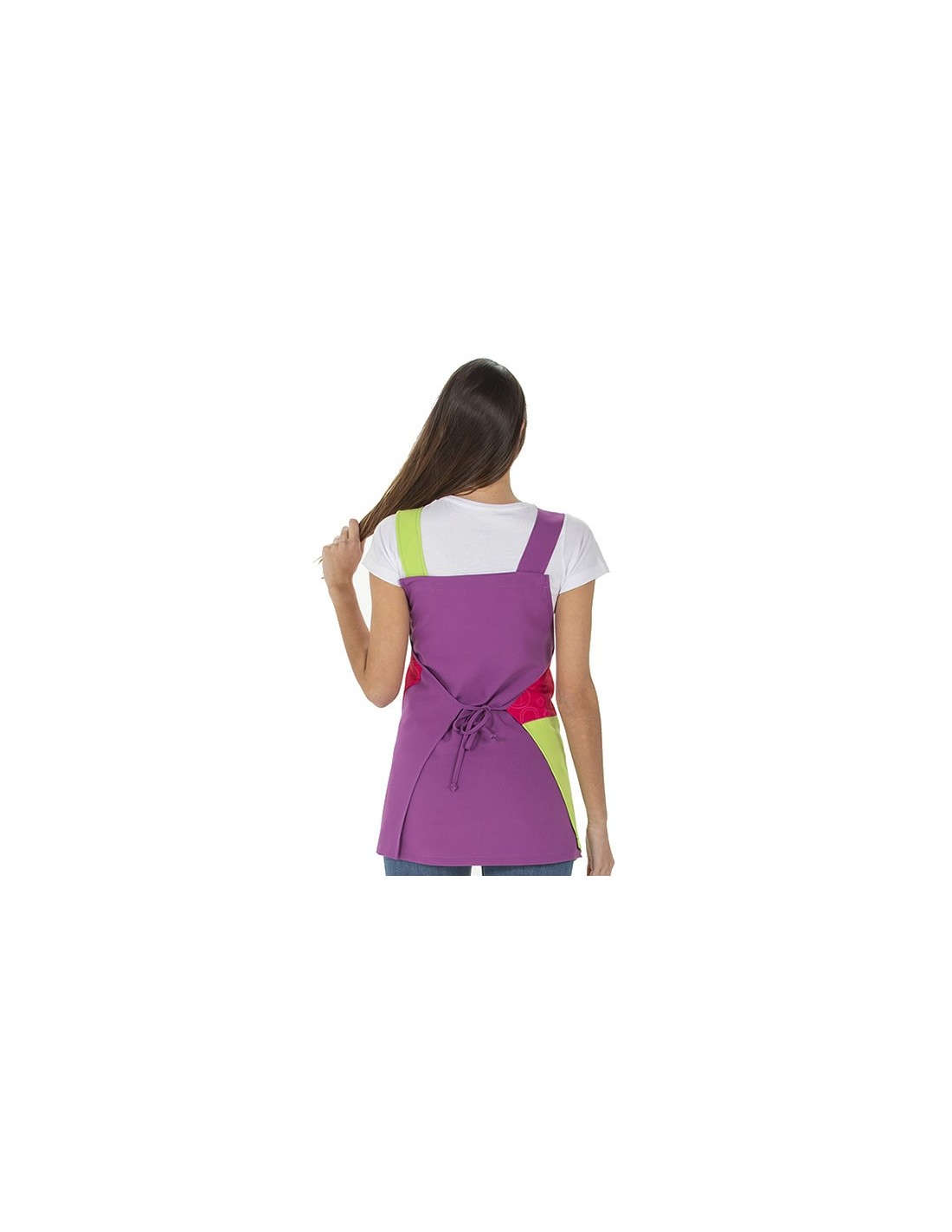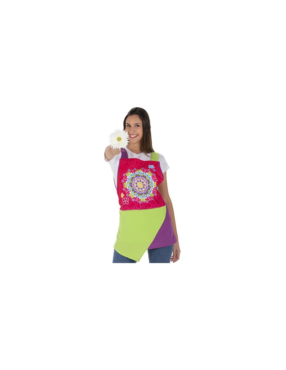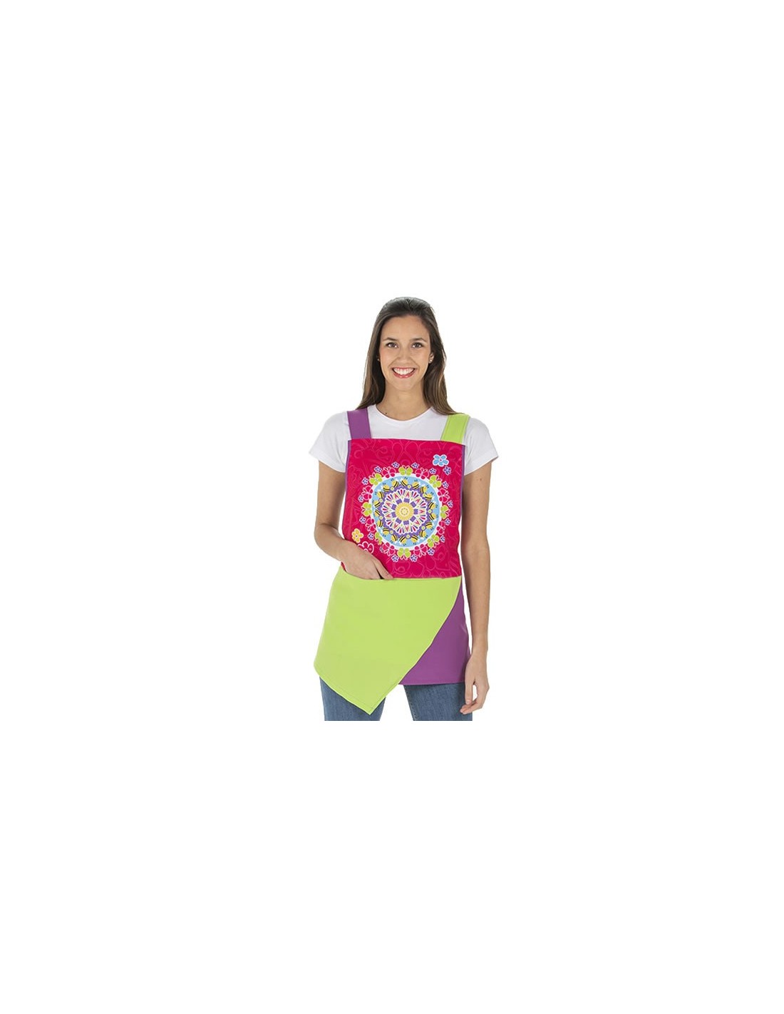 Estola de maestra con diseño mandala, en divertidos colores pistacho, morado y fucsia. Diseño muy original con terminación delantera desigual. Bolsillo delantero. Multitalla ajustable con cintas (de la XS a la XXL).