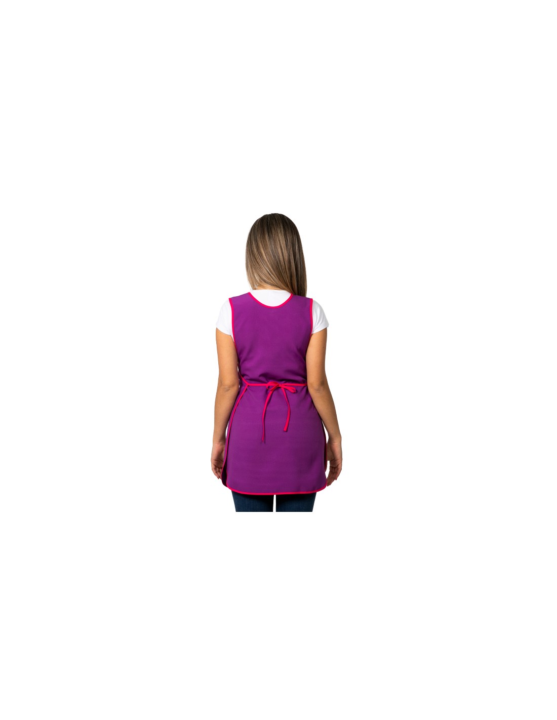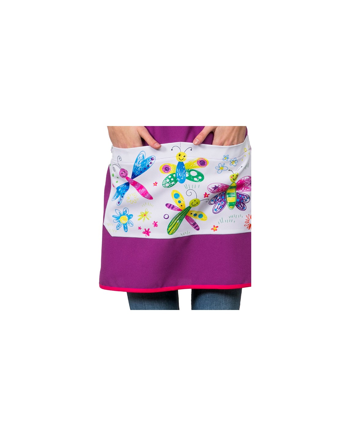 Bonita estola de maestra de color morado y vivo fucsia combinado con estampado de mariposas de colores en el bolsillo delantero divisorio. Multitalla ajustable con cintas. Disponible en talla Standard (P) y talla Maxi (G). Puedes visualizar las medidas en la foto. Tejido de tacto suave y agradable.