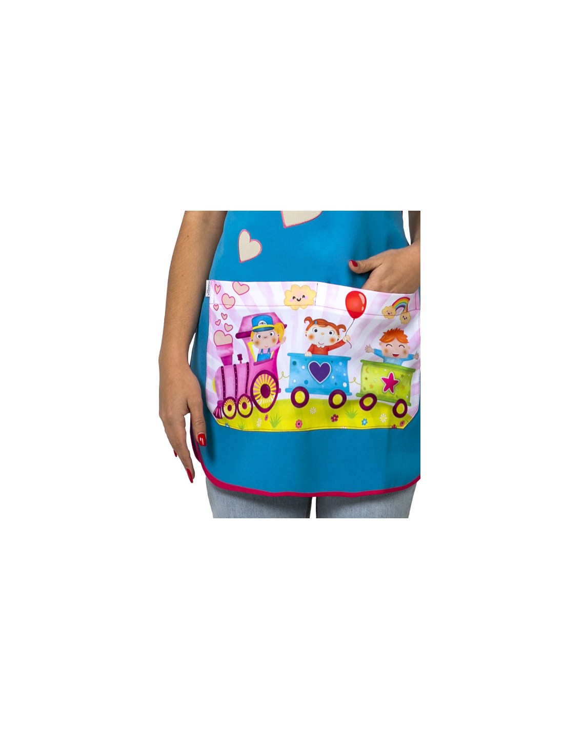 Estola para maestra de color azul con bies fucsia a contraste. Bolsillo central delantero divisorio con divertido estampado de niños en tren. Corazones bordados en pecho. Cuello redondo. Multitalla ajustable con cintas disponible en talla P y G.