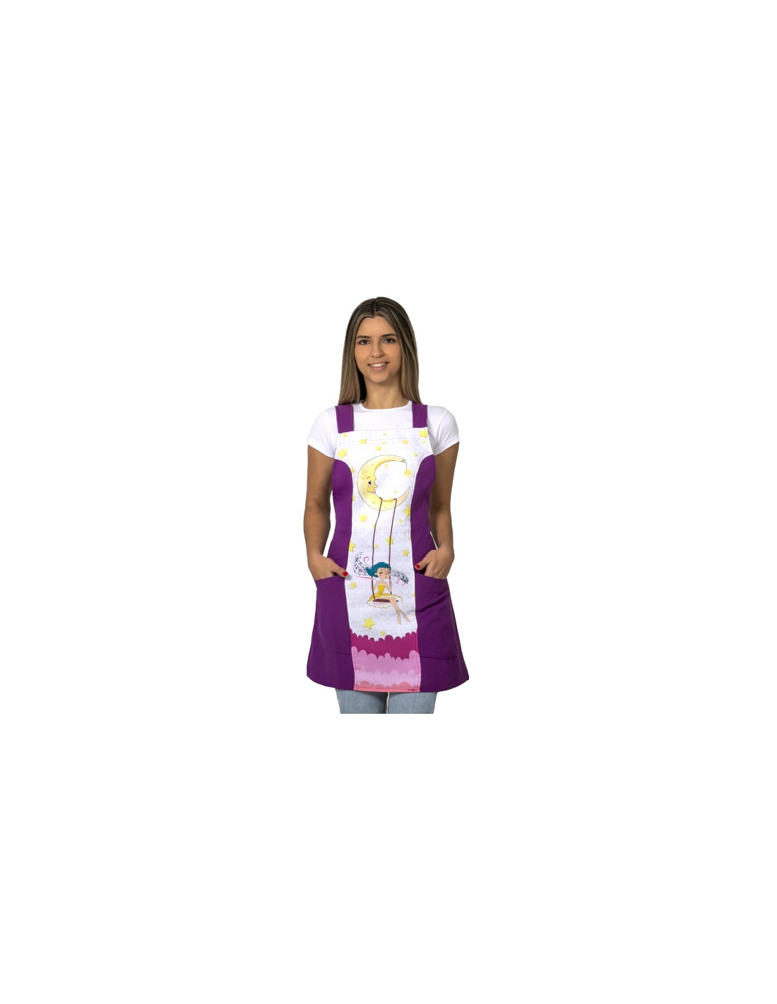 Estola para maestra de color morado con estampado delantero de niña silbando y columpiándose bajo la luna. Dos bolsillos laterales. Multi talla ajustable con cintas (de la talla XS a la XXL).