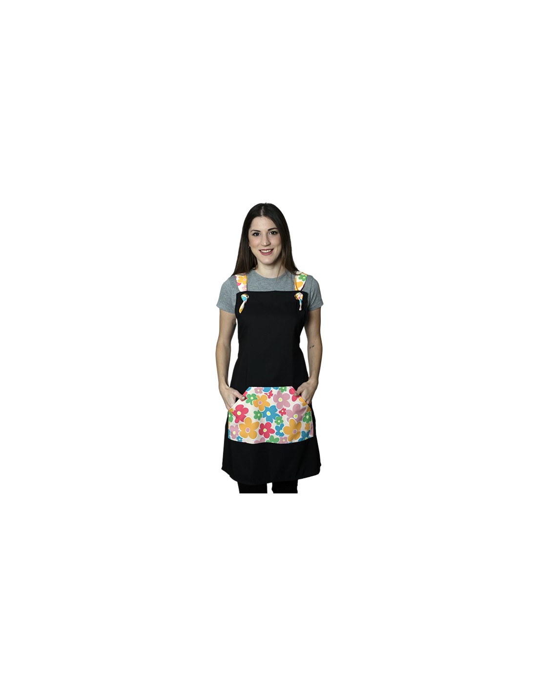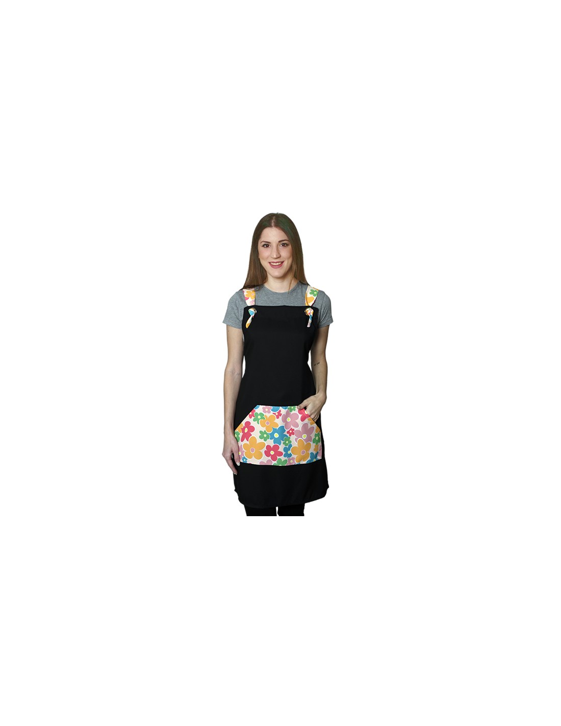 Estola maestra negro con bolsillo y tirantes estampados de flores de colores. Un amplio bolsillo hexagonal central delantero. Tirantes regulables con ojal metálico. Multitalla ajustable con cintas. 100% MICROFIBRA de fácil lavado y secado.