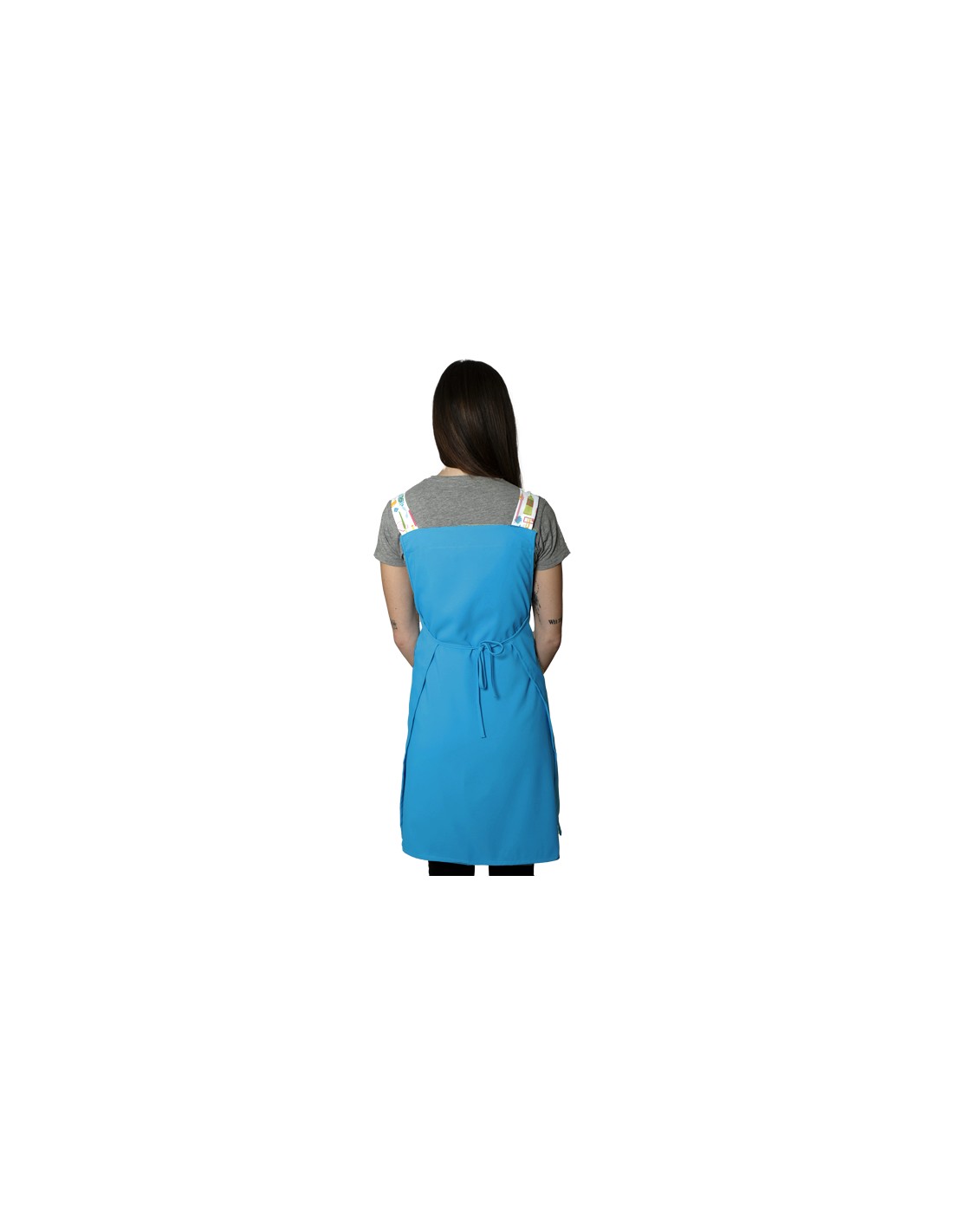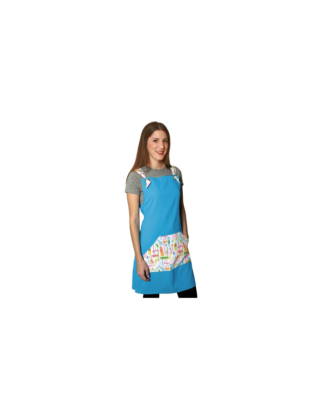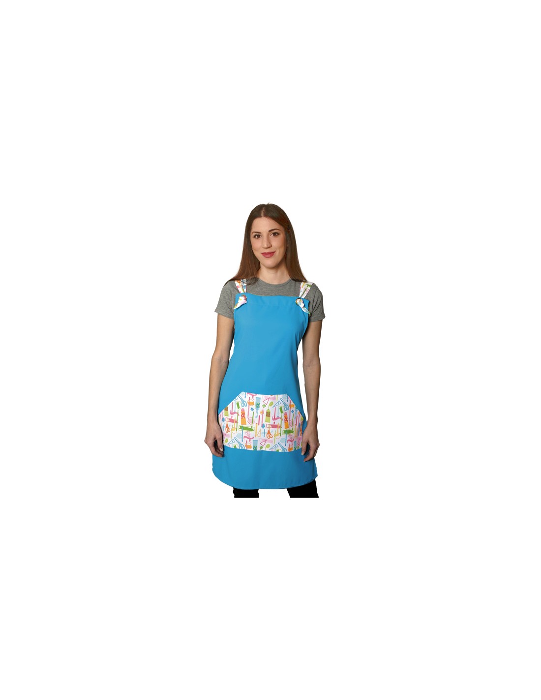 Estola maestra turquesa con bolsillo y tirantes estampados de material escolar. Un amplio bolsillo hexagonal central delantero. Tirantes regulables con ojal metálico. Multitalla ajustable con cintas. 100% MICROFIBRA de fácil lavado y secado