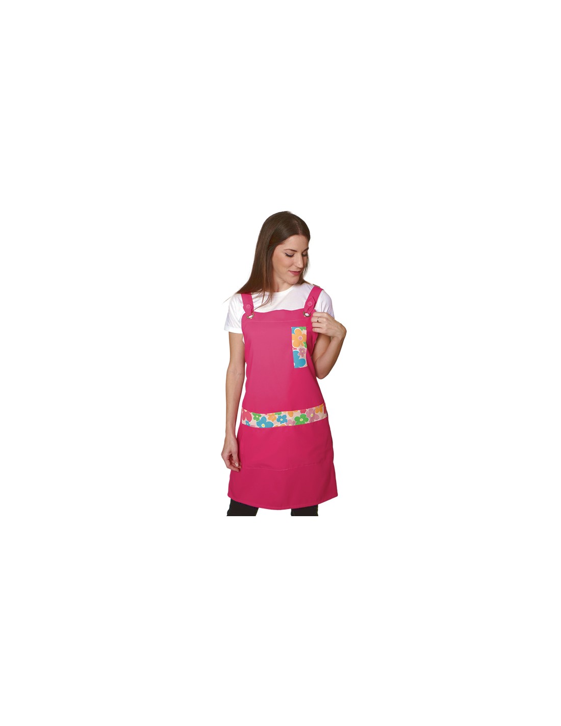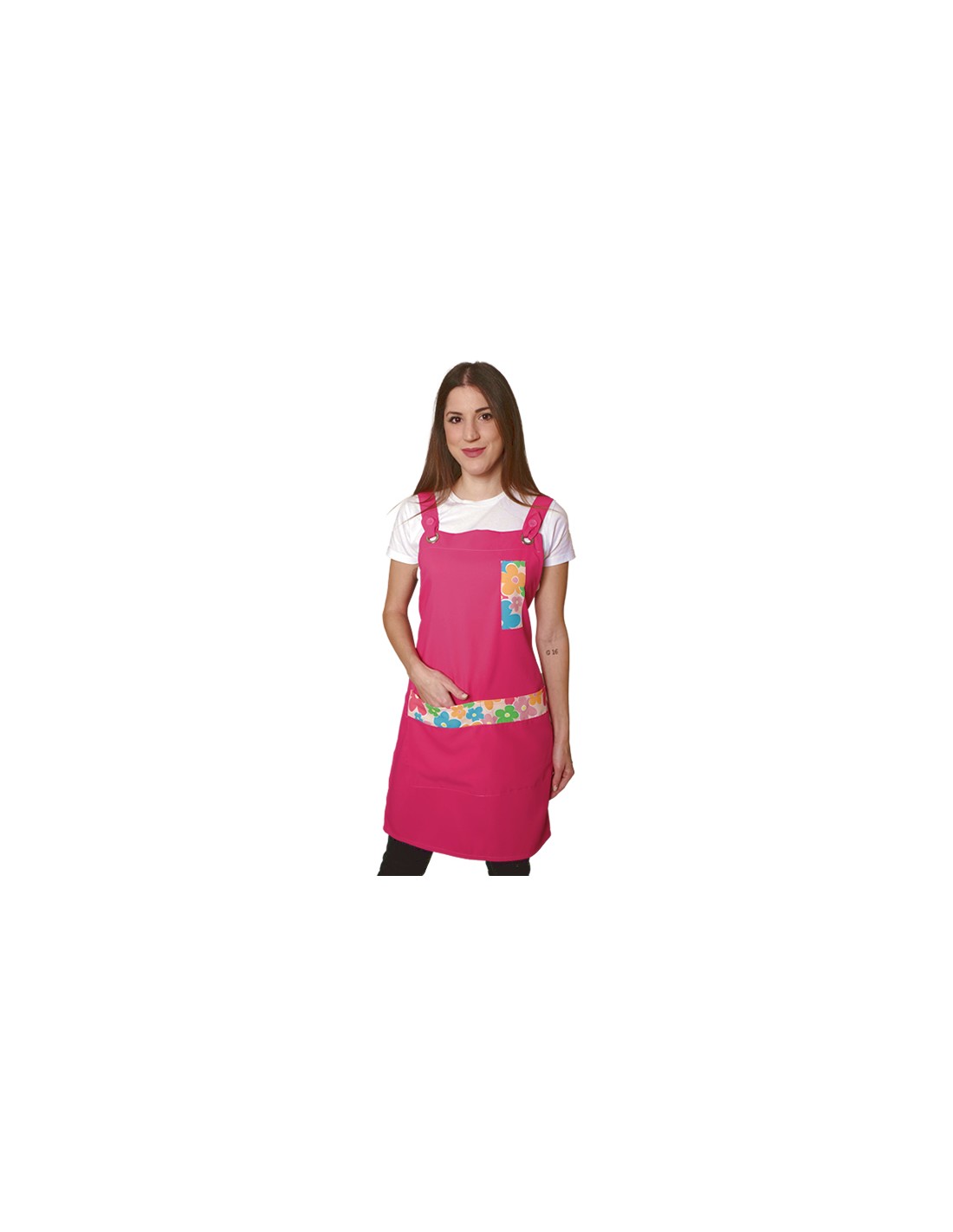 Estola maestra fucsia combinada con estampado de flores de colores. Dos bolsillos, uno pequeño en pechera para el bolígrafo y uno mas amplio central delantero. Tirantes regulables con botón decorativo y ojal metálico. Multitalla ajustable con cintas. 100% MICROFIBRA de fácil lavado y secado.