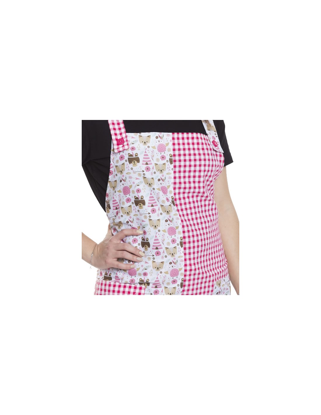 No se olvide de guardar su personalización antes de añadir a la cestaEstola para maestra de color fucsia combinado con estampado de animales tipi en pechera derecha y en bolsillo izquierdo. Tirantes cruzados en espalda con botón decorativo. Dos amplios bolsillos.