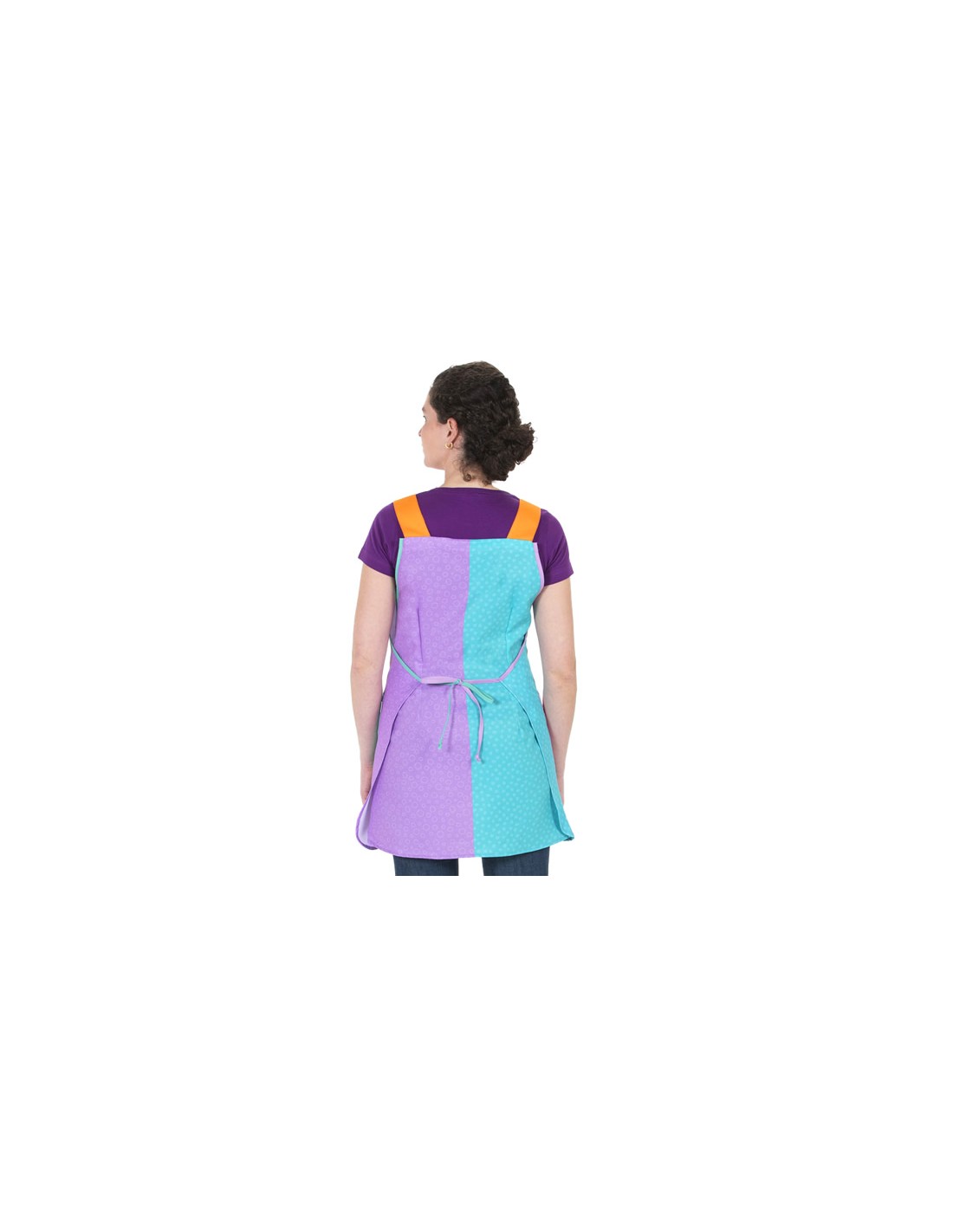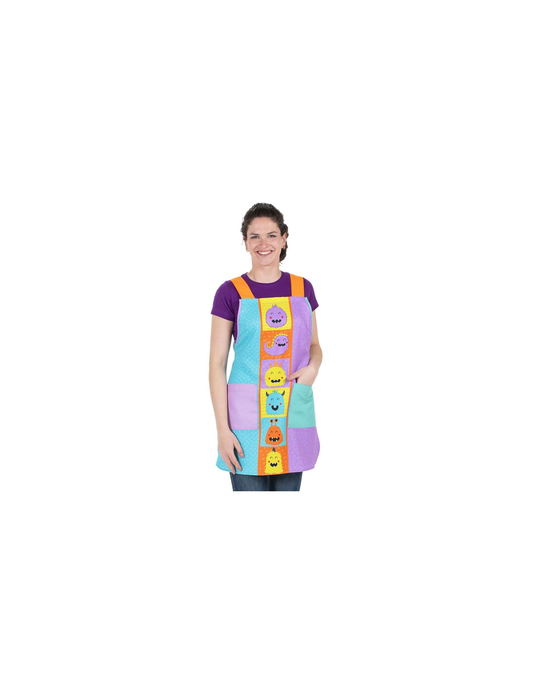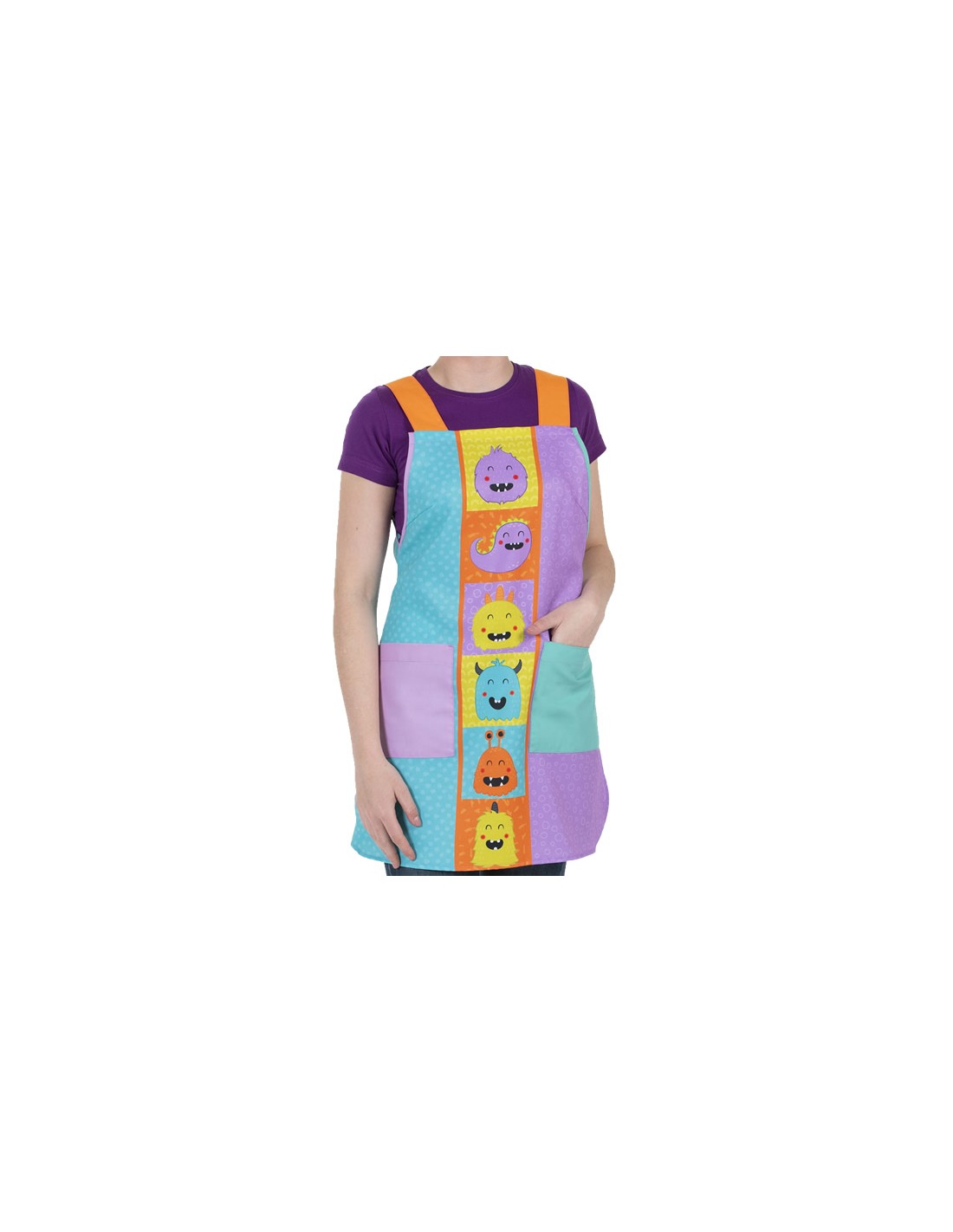 Estola maestra de color turquesa y lila con franja delantera estampada de graciosos monstruos. Dos amplios bolsillos de color a contraste. Composición 100% Poliéster tejido transpirable, de fácil lavado y rápido secado. Multi talla ajustable con cintas (de la XS a la XXL). Largo aprox 82 cm.