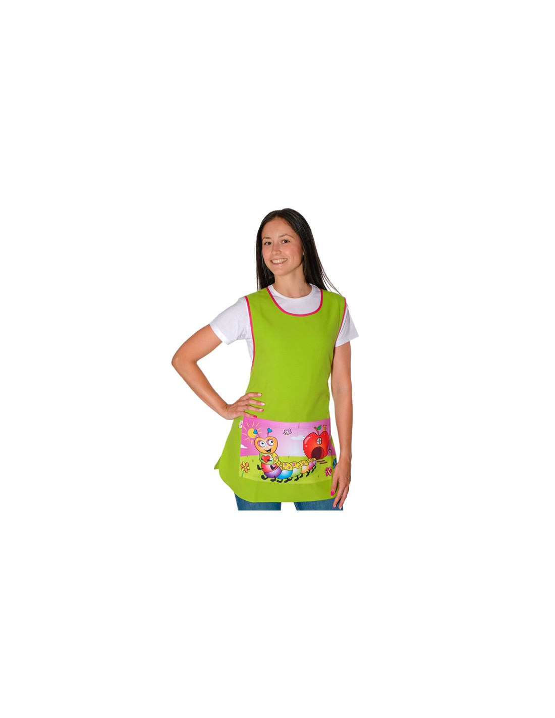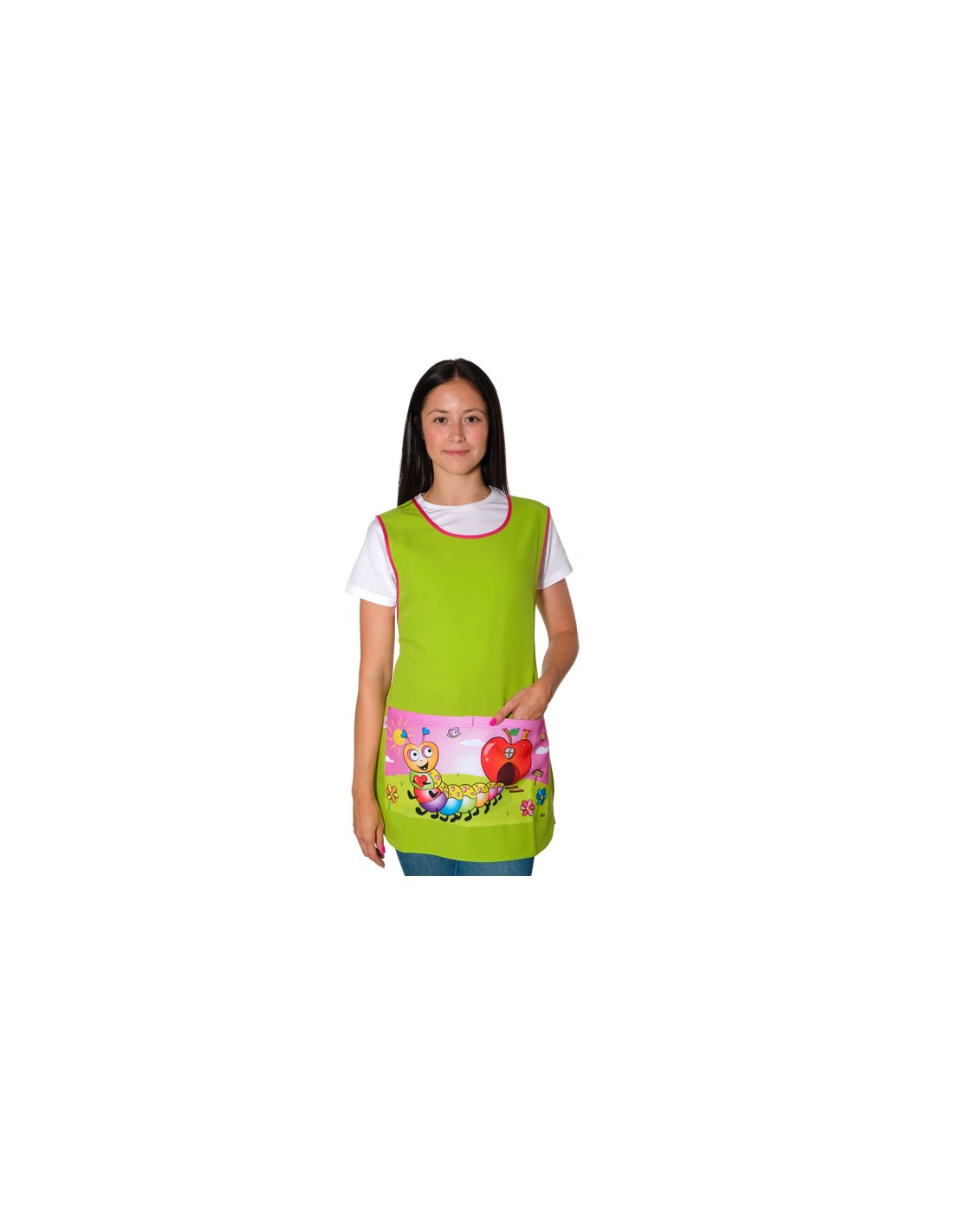 ÚNICA Y EXCLUSIVA estola para maestra de color pistacho con gracioso estampado de gusano de colores en bolsillo. Bies de color fucsia a contraste. Un bolsillo central delantero divisorio con dos bolsillitos mas pequeños en su interior para los objetos más pequeños. Composición 100% Poliéster, tejido transpirable, de fácil lavado y rápido secado. Multi talla ajustable con cintas (de la XS a la XXL).