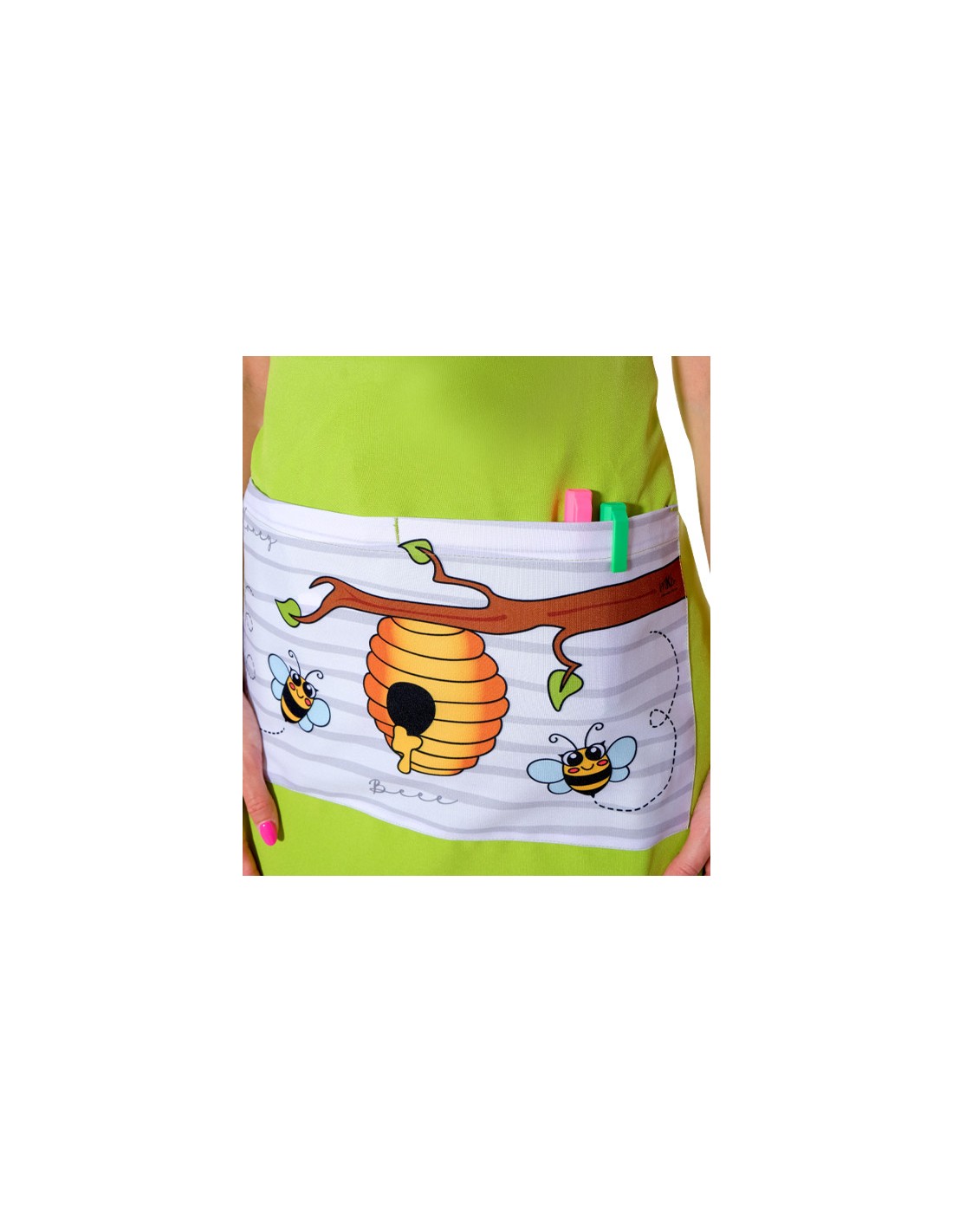 No se olvide de guardar su personalización antes de añadir a la cestaEstola de color pistacho para maestra con divertido estampado en bolsillo de abejitas. Abejas bordados en pecho. Su tejido permite un lavado, secado y planchado fácil y rápido