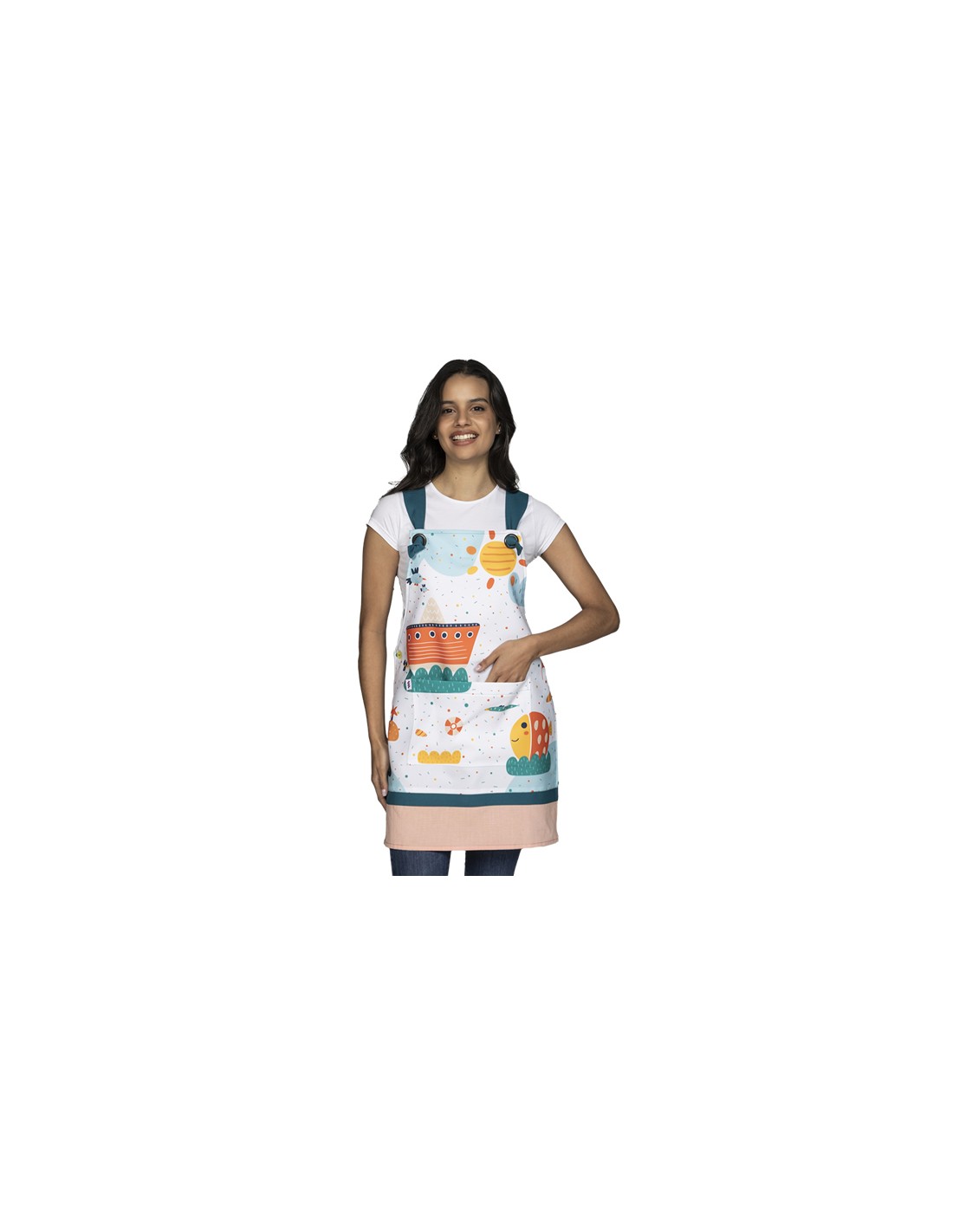 Bonita estola de maestra con estampado marino con divertido pez acompañado de un barco. Tirantes y aplique en el bajo de color verde petróleo combinado en el bajo con tejido de color naranja. Gran bolsillo central. Multi talla ajustable con botones en los laterales (de la XS a la XXL). Tejido de fácil lavado y secado y muy agradable al tacto.