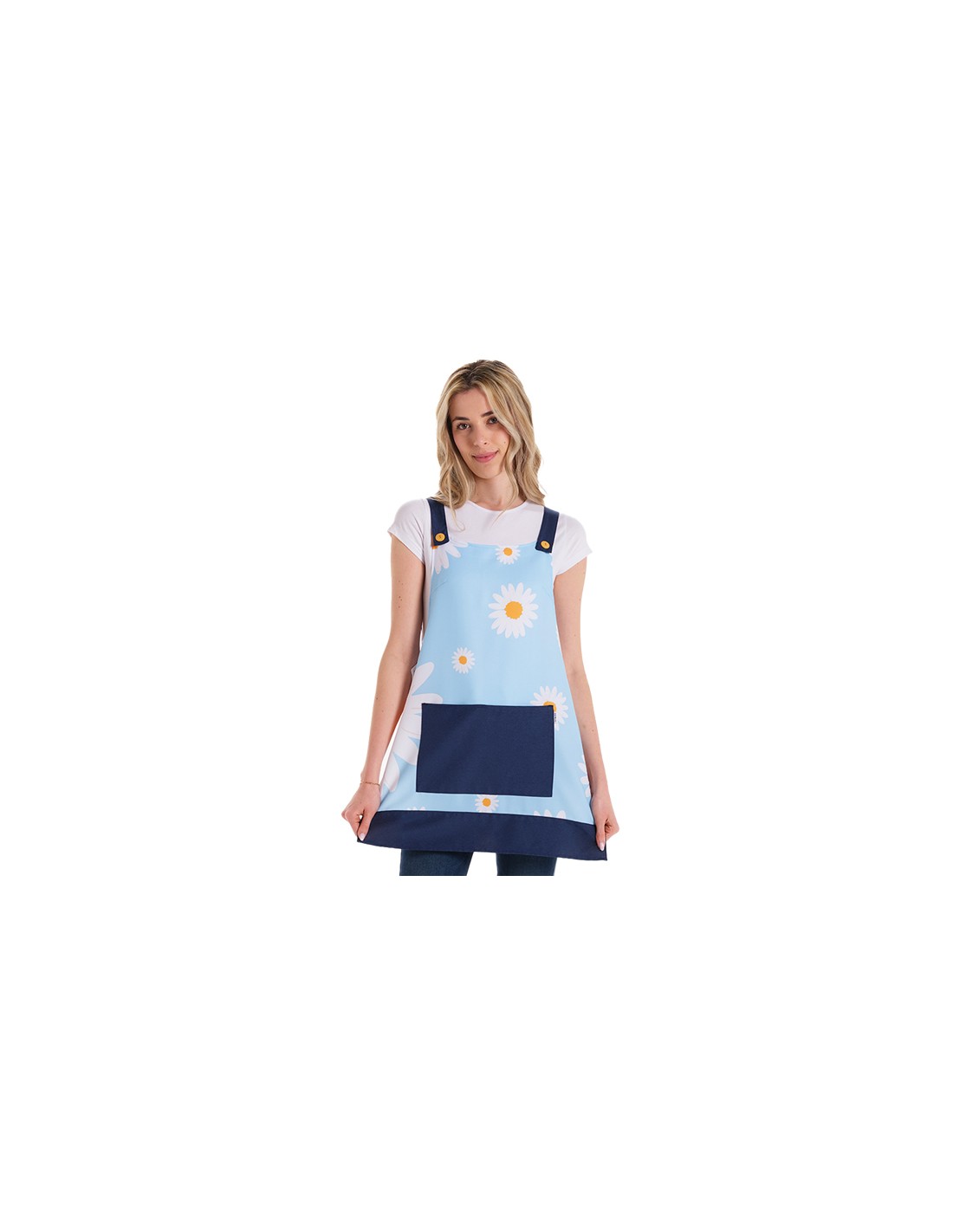 Divertida estola de maestra de color azul cielo con estampado delantero de divertidas margaritas, parte trasera de color azul marino a juego con los tirantes y el bolsillo central delantero. Pinzas en pecho y espalda para mayor adaptabilidad y ajuste al cuerpo. Talla única, ajustable mediante botones laterales en 3 posiciones adaptable desde la talla XS a la talla XXL. Largo aprox. 83cm. Tejido 100% poliéster.