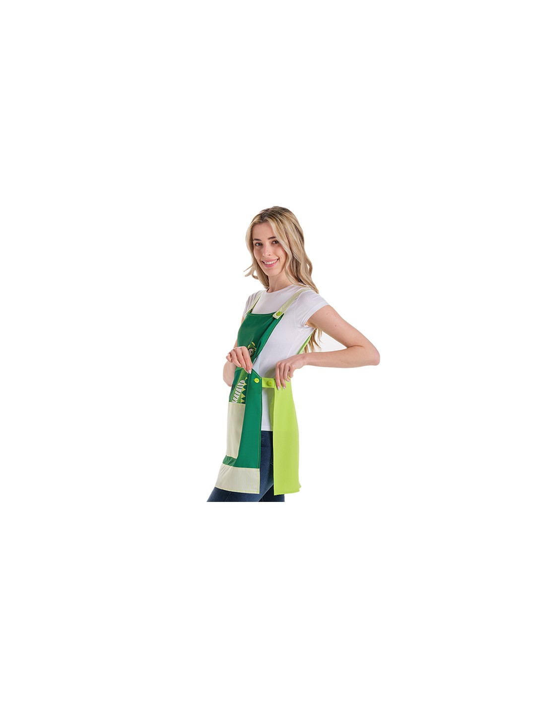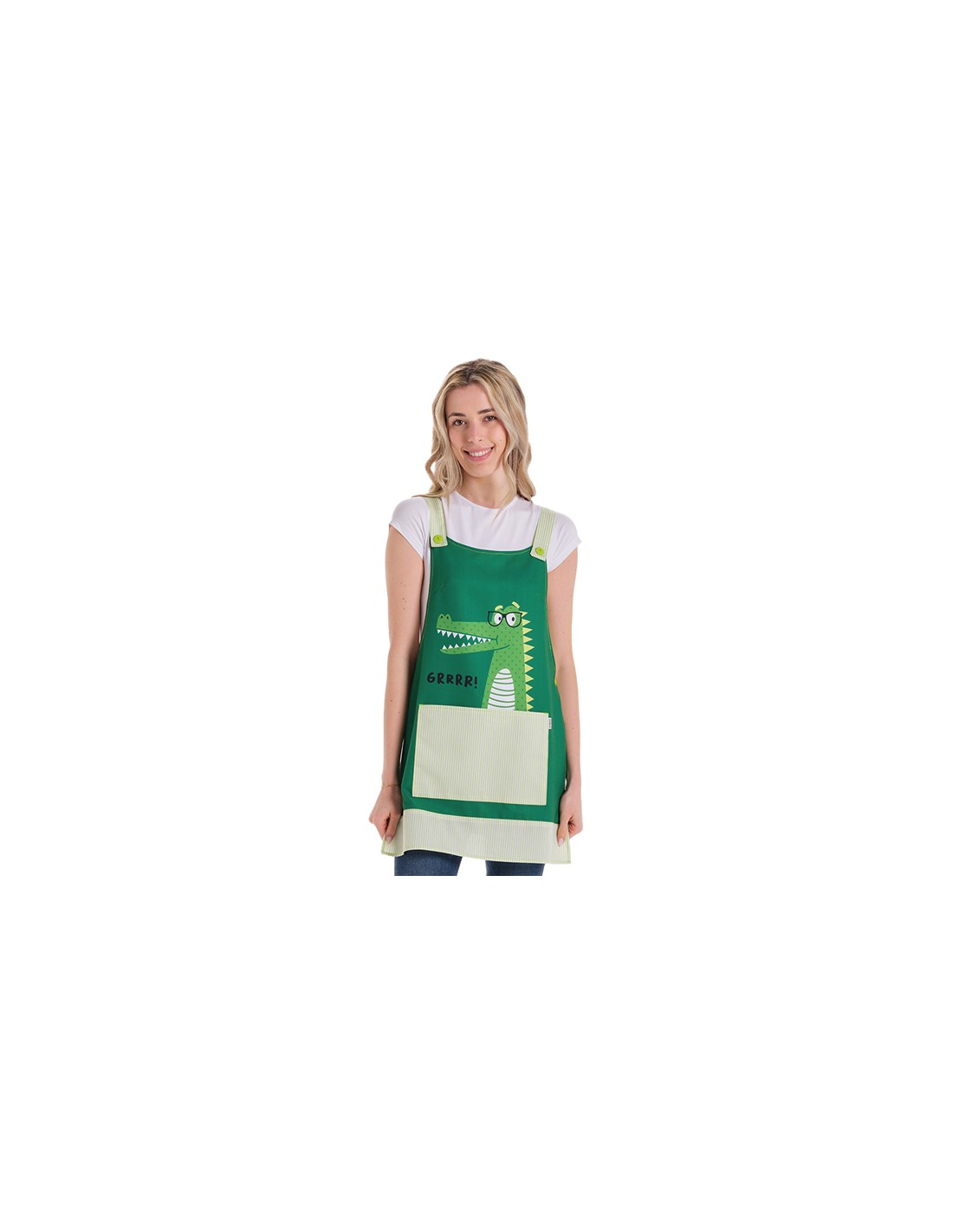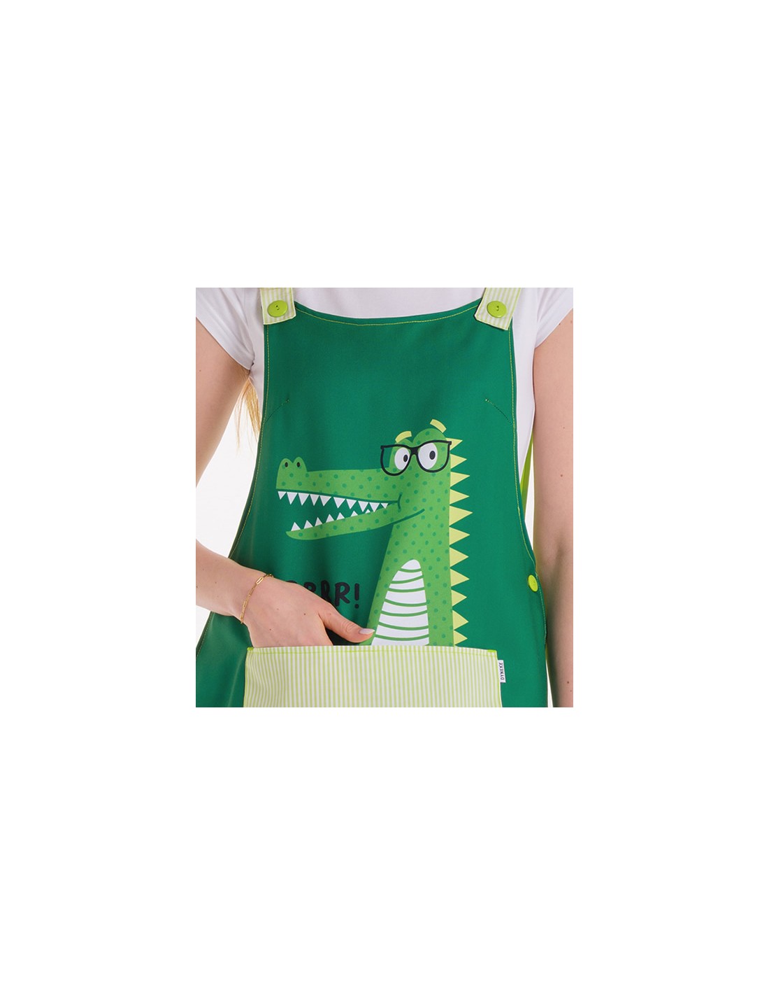 Estola confeccionada en poliéster de color verde y espalda en tejido terlenka de color pistacho, estampado delantero de divertido cocodrilo con bolsillo delantero, bajos y tirantes en tejido de Vichy de cuadro verdes, botones de los tirantes decorativos en color verde clarito. Pinzas en pecho mayor adaptabilidad. Talla única, ajustable mediante botones laterales en 3 posiciones adaptable desde la talla XS a la talla XXL. Largo aprox. 83cm