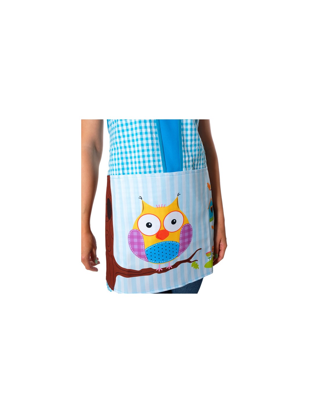 Estola de maestra con divertido estampado de búho, confeccionada con tejido Vichy bambula de color azul 65% Algodón 35% Poliéster. Tejido de alta calidad agradable al tacto y resistente de fácil lavado y secado. Combina los cuadros de color blanco y color azul. Bolsillo central a la altura de la cadera con divertido estampado de búho posado en la rama de un árbol. Talla única, se ajustable con cintas y se adapta al cuerpo desde la talla XS a la talla XXL. Llamativa y divertida.