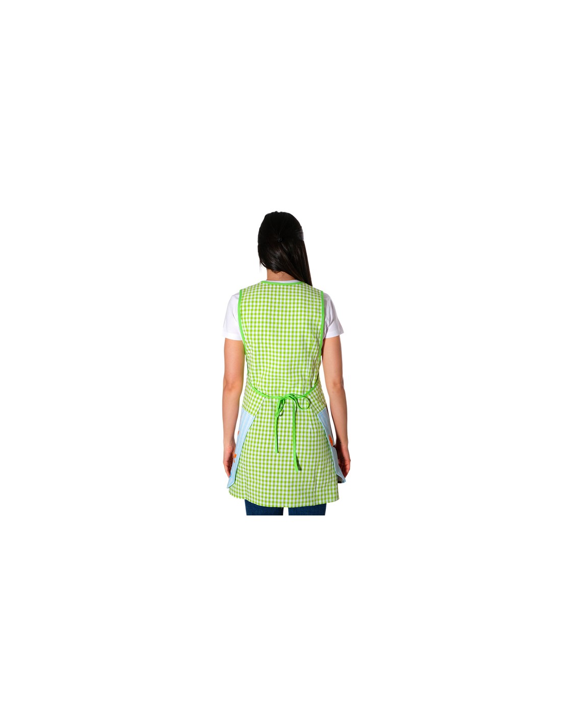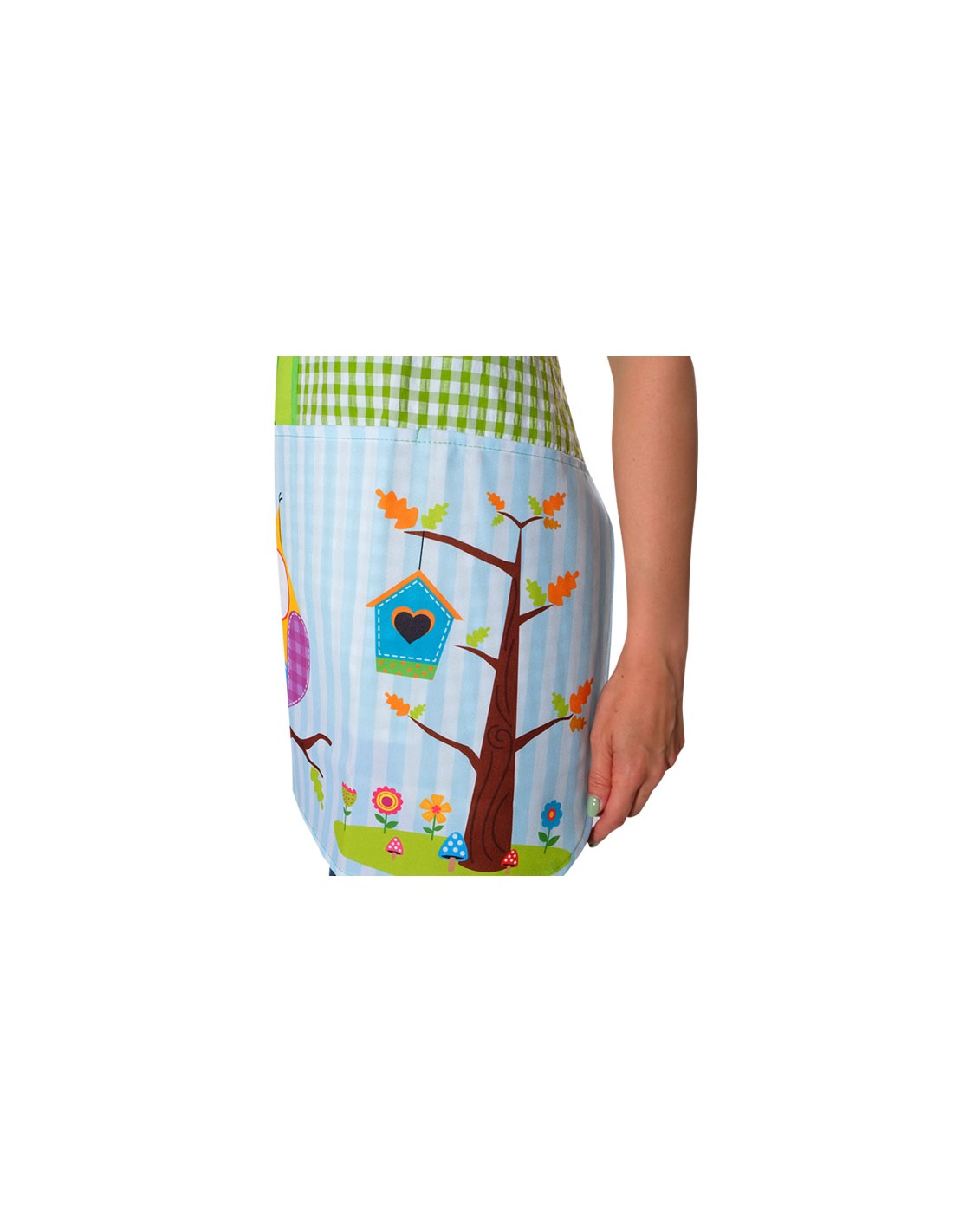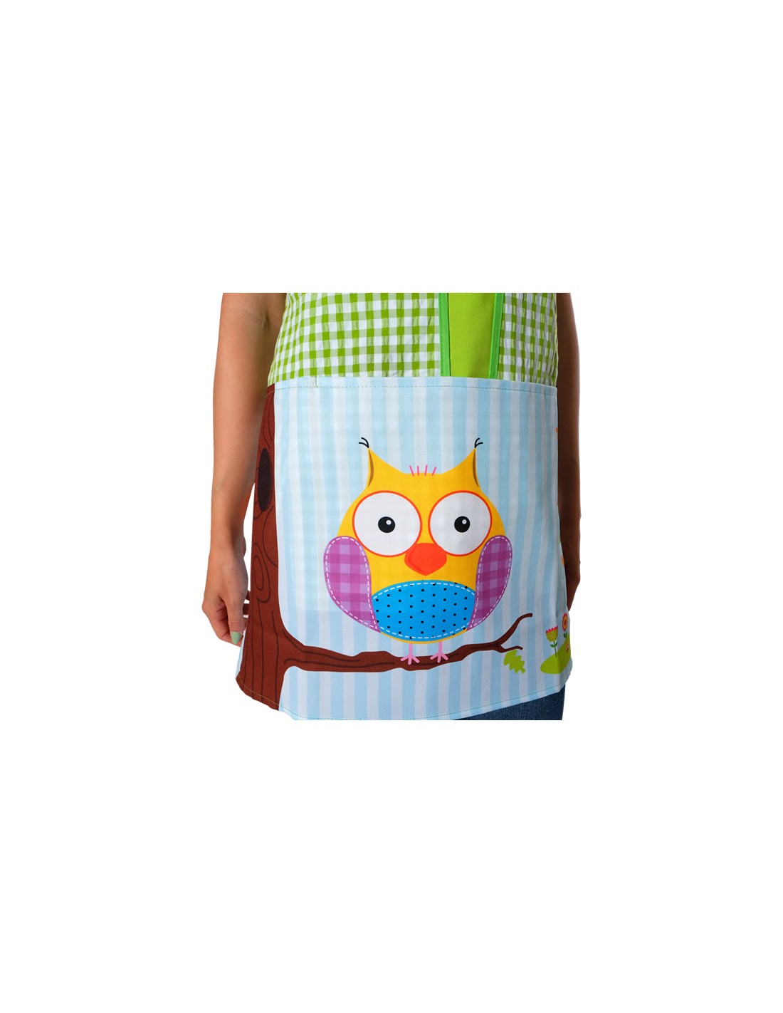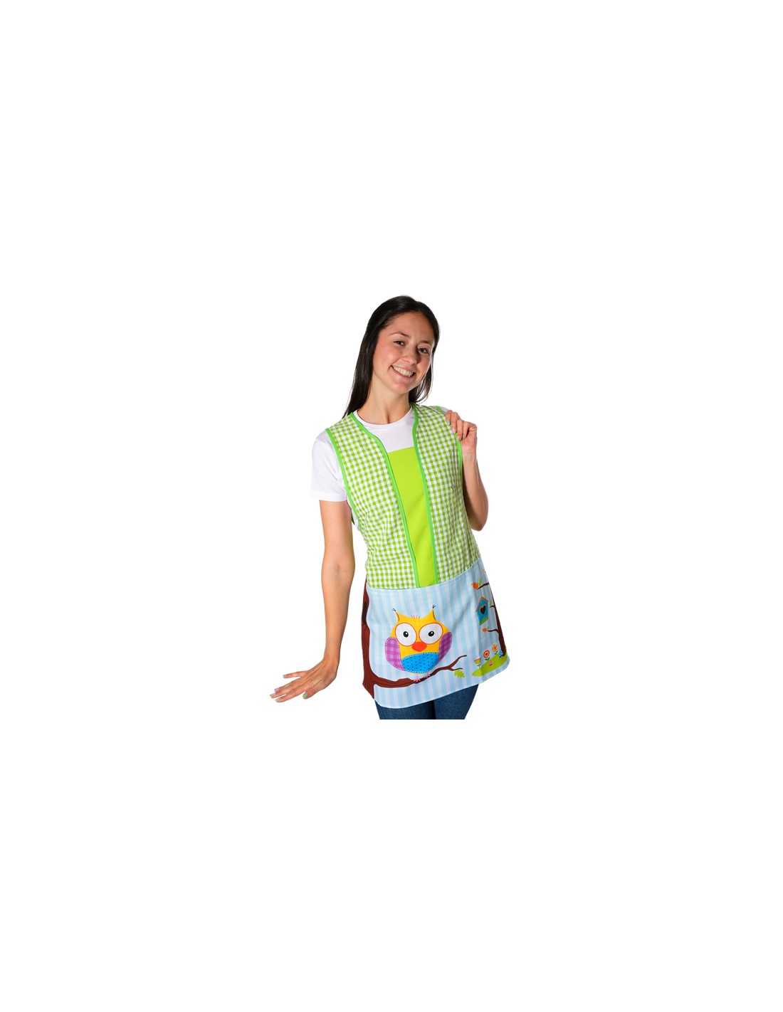 Estola de maestra con divertido estampado de búho, confeccionada con tejido Vichy bambula de color pistacho 65% Algodón 35% Poliéster. Tejido de alta calidad agradable al tacto y resistente de fácil lavado y secado. Combina los cuadros blancos y color pistacho. Bolsillo central a la altura de la cadera con divertido estampado de búho posado en la rama de un árbol. Talla única, se ajustable con cintas y se adapta al cuerpo desde la talla XS a la talla XXL. Llamativa y divertida.