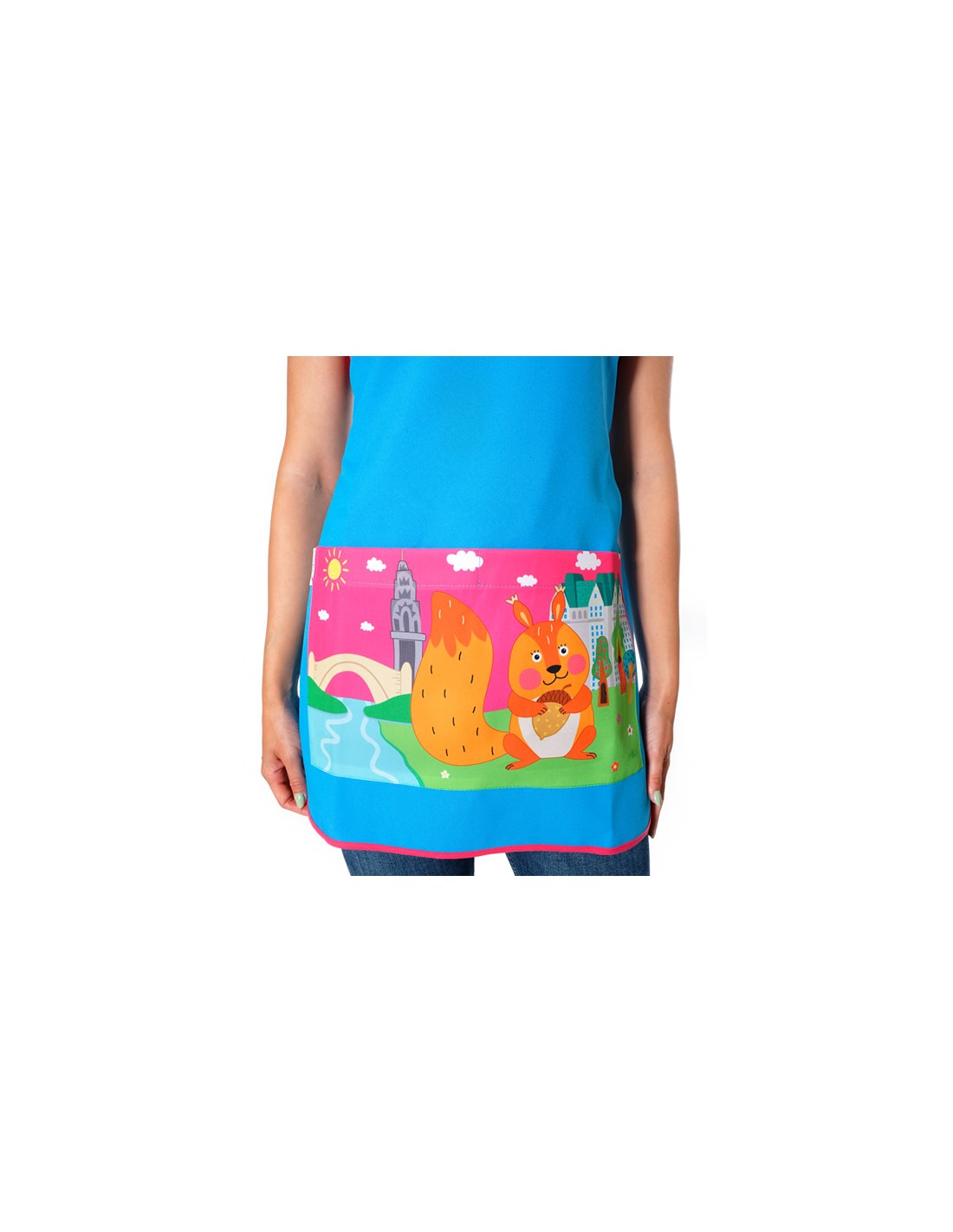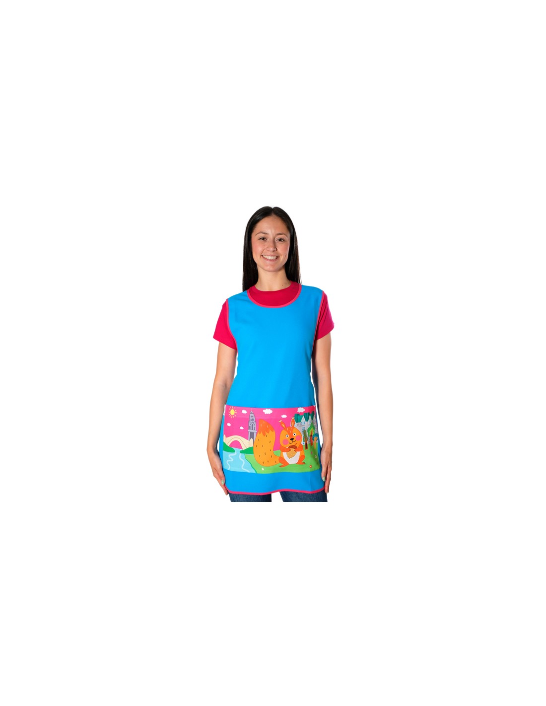 Estola de maestra de color azul turquesa con divertido estampado en el bolsillo de alegre ardilla en Central Park de New York. Bies de color fucsia a contraste con el estampado. Gran bolsillo central delantero divisorio con dos bolsillos interiores para los bolígrafos, móvil o los objetos más pequeños. Confeccionada con tejido 100% POLIESTER de fácil lavado y rápido secado. Talla única, se ajusta mediante cintas y se adapta al cuerpo desde la talla XS a la XXL.