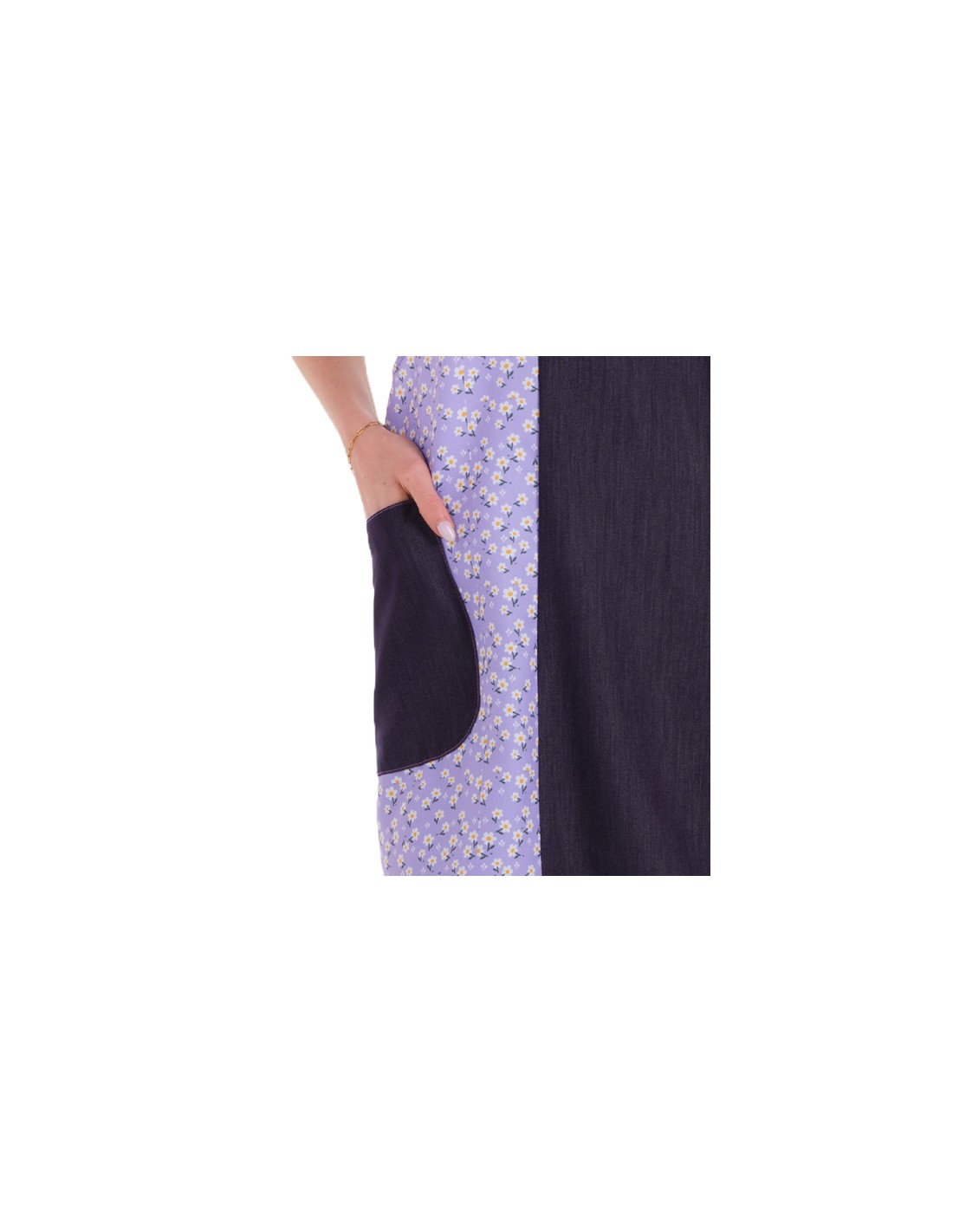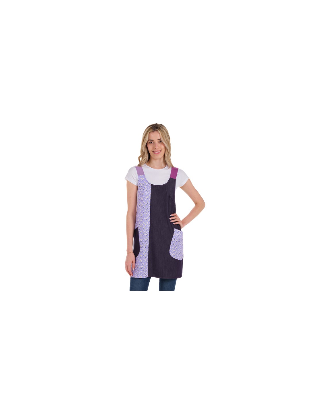 Estola maestra denim con tejido elástico combinada con estampado de flores de color lila jaspeadas. Espalda cruzada, dos amplios bolsillos. Se adapta y ajusta al cuerpo sin necesidad de cintas ni botones. Disponible en 2 tallas: talla M (adaptable desde la talla SP a la G) y talla XL ( adaptable desde la talla XL-a la 3XL). Largo aproximado 92 cm.