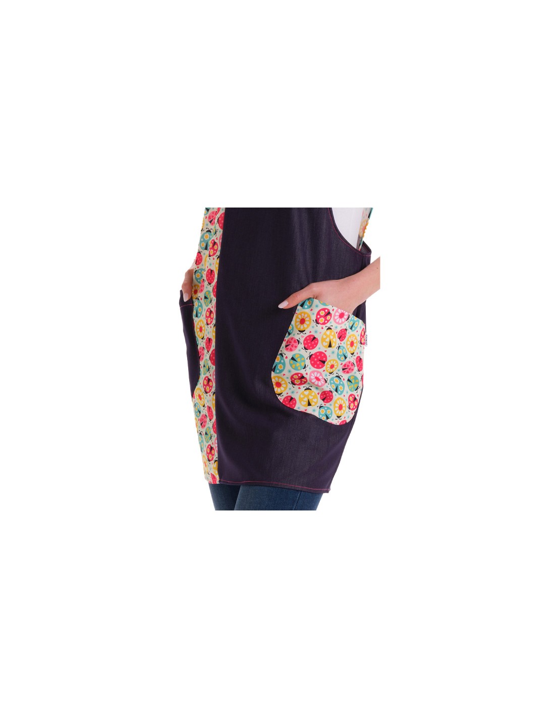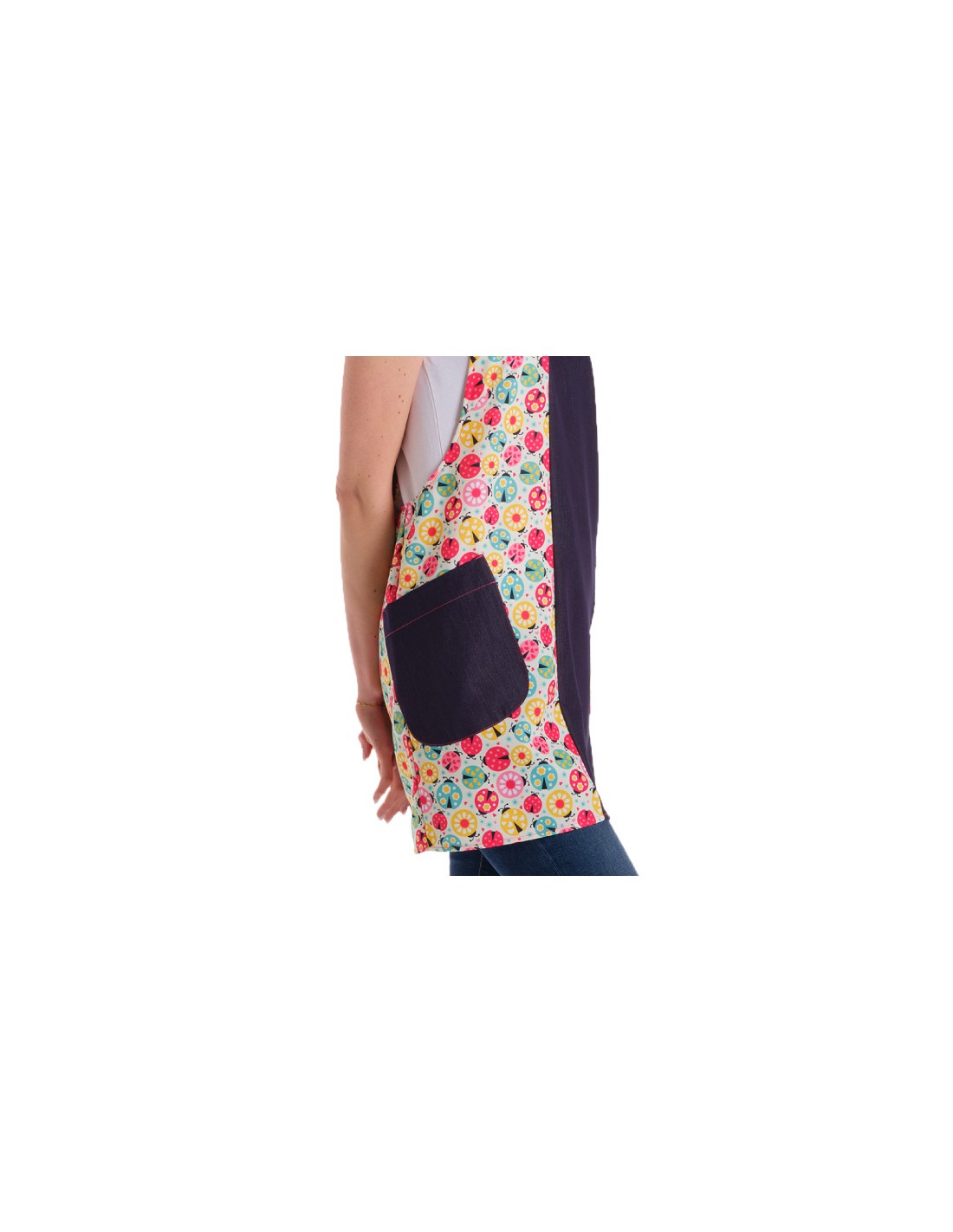 Estola maestra denim con tejido elástico combinada con estampado de flores y mariquitas de colores. Espalda cruzada, dos amplios bolsillos. Se adapta y ajusta al cuerpo sin necesidad de cintas ni botones. Disponible en 2 tallas: talla M (adaptable desde la talla SP a la G) y talla XL ( adaptable desde la talla XL-a la 3XL). Largo aproximado 92 cm.