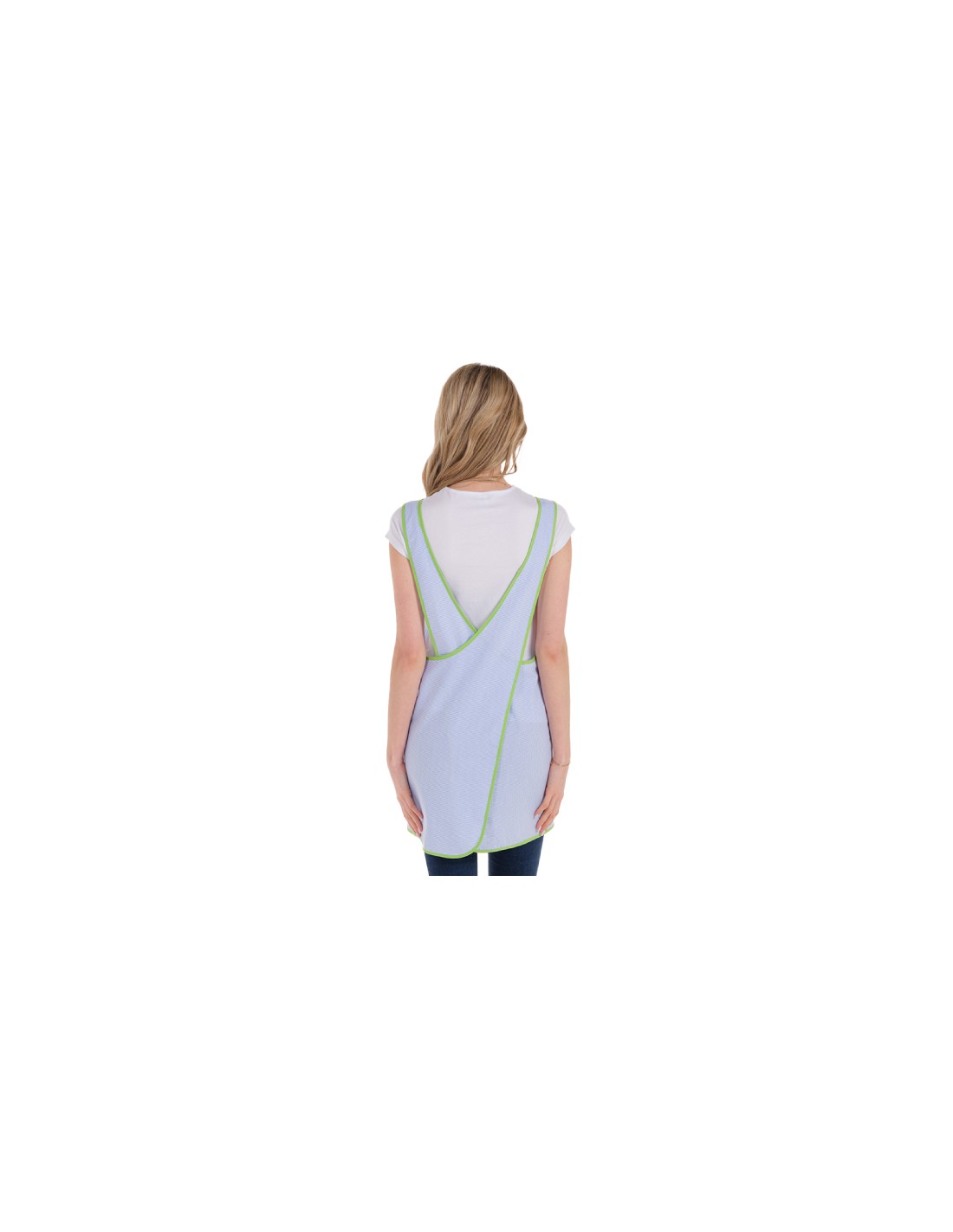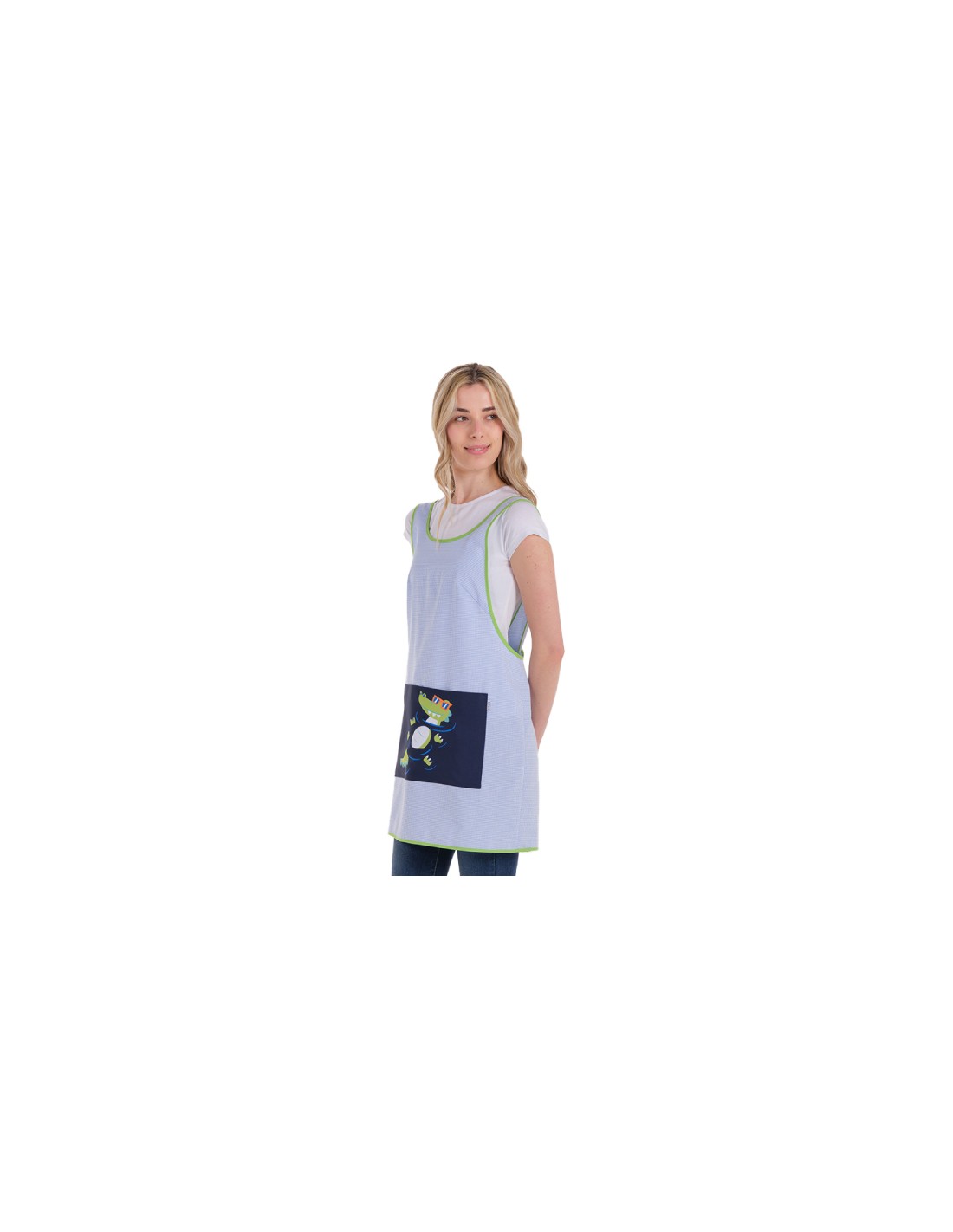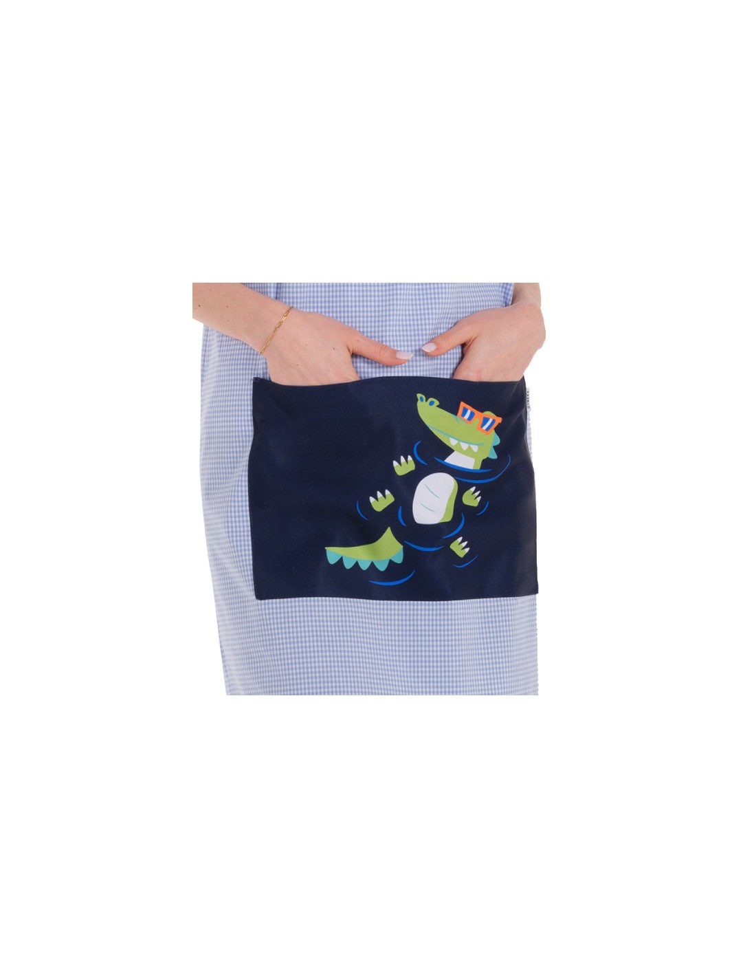 Estola confeccionada en tejido vichy azul de cuadro pequeño combinado con vivo pistacho a contraste. Amplio bolsillo central delantero divisorio en denim con gracioso cocodrilo. Espalda de tirantes cruzados. Largo aproximado 92 cm. Multi talla.