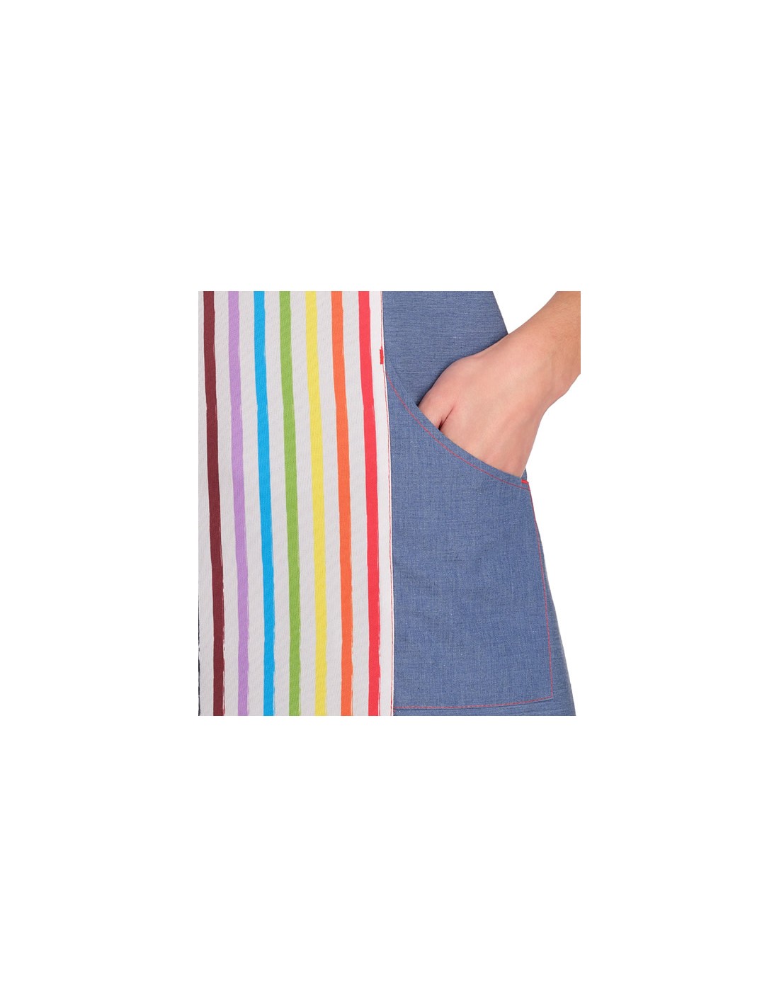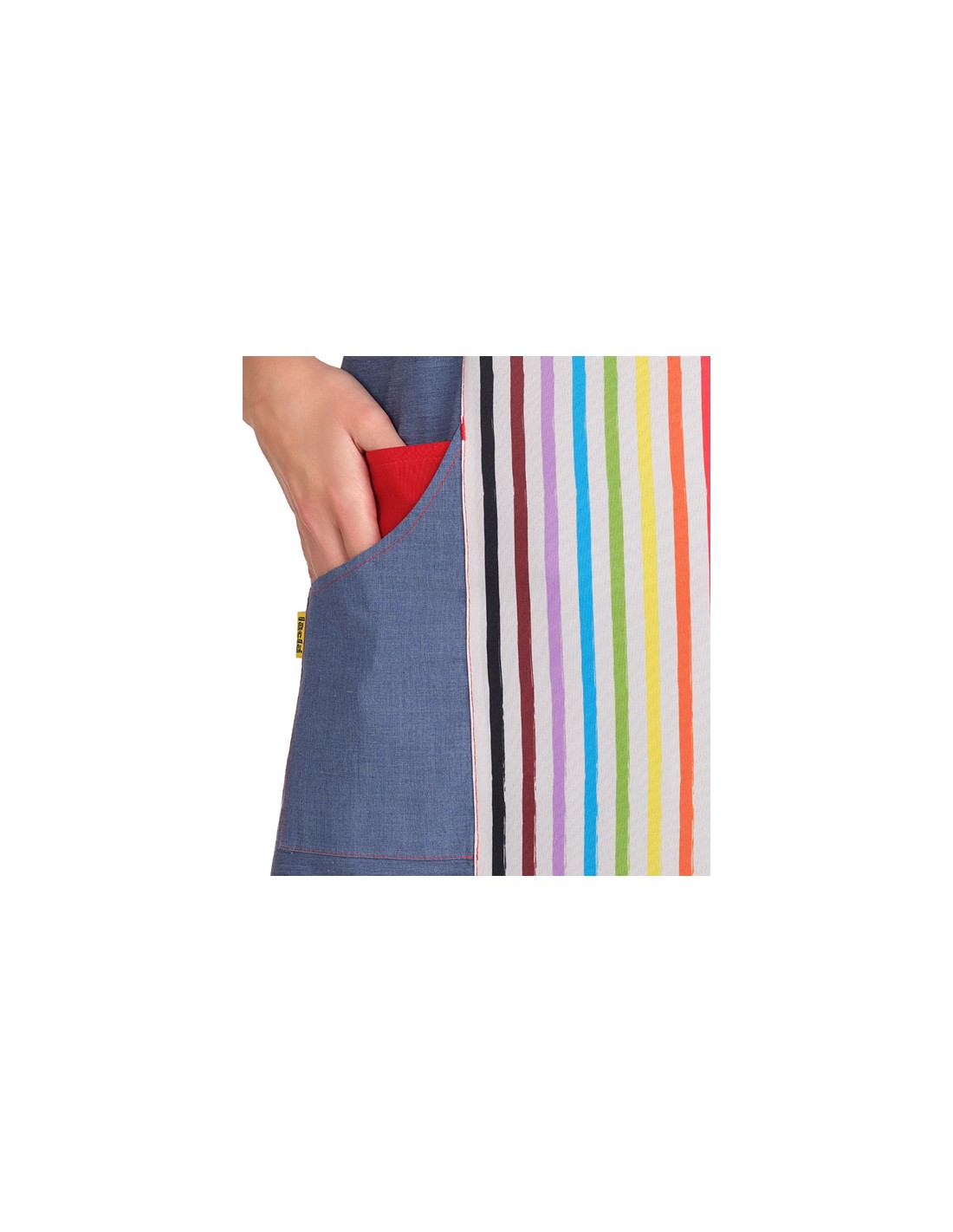 Estola de maestra combinada con parte delantera en tejido estilo denim y espalda en color rojo. Estampado de lápices de colores con nombres en inglés. Tres bolsillos delanteros. Pinzas en la espalda y tiras laterales para un mejor ajuste. Presillas de refuerzo en las esquinas de los bolsillos y en las tiras.