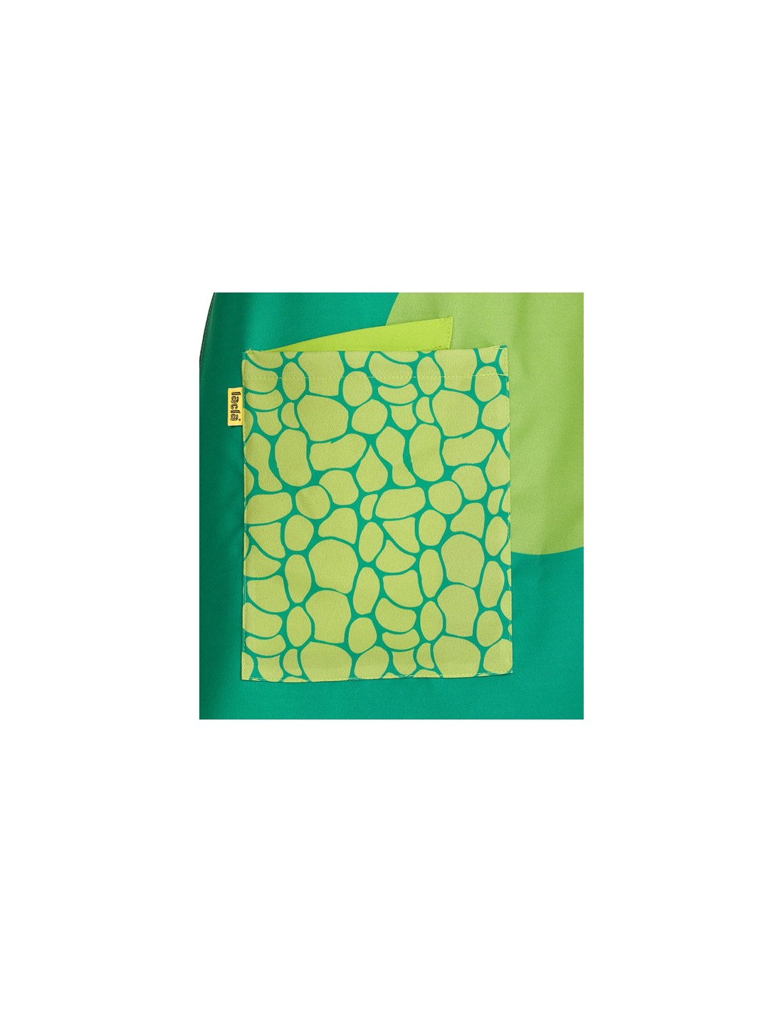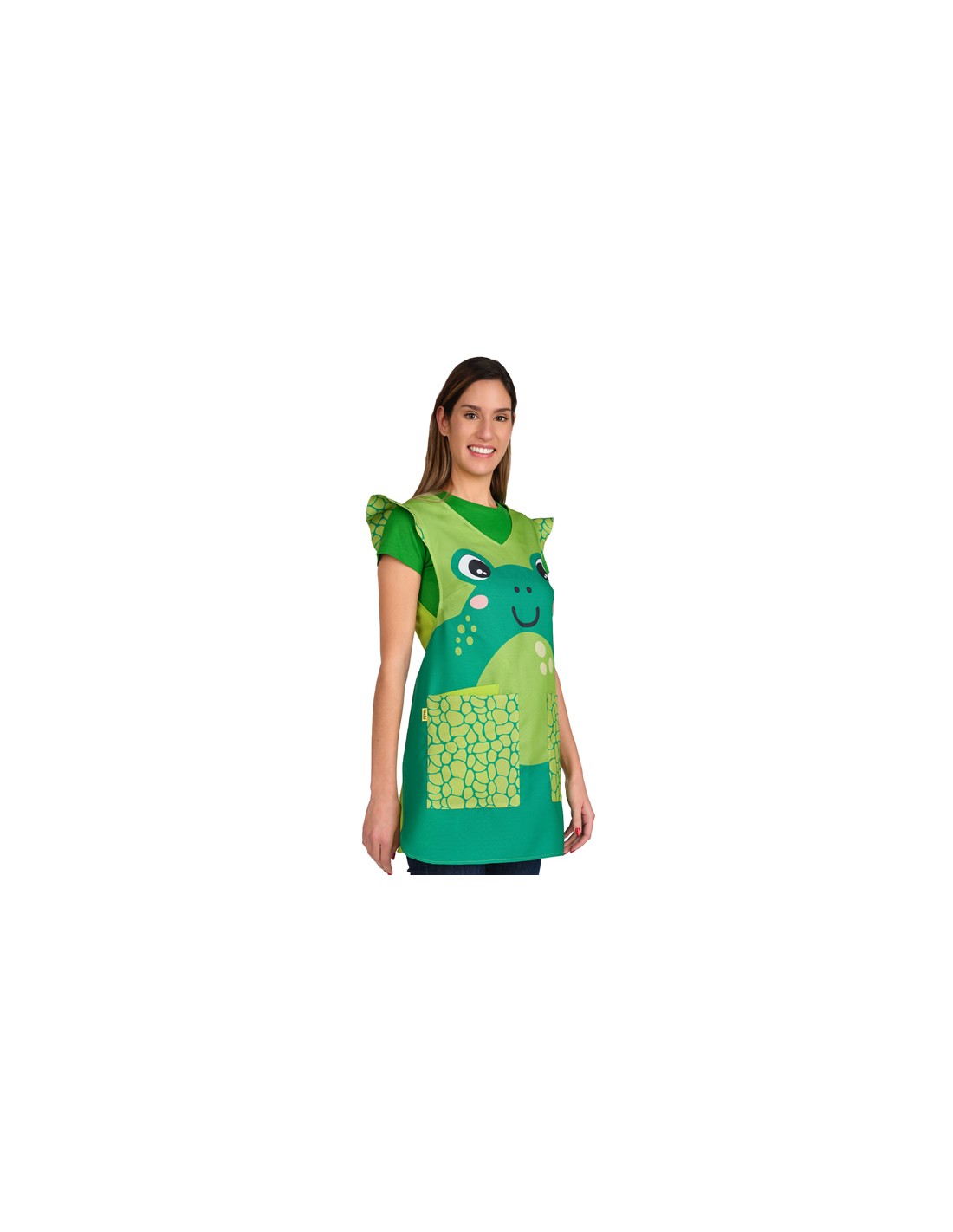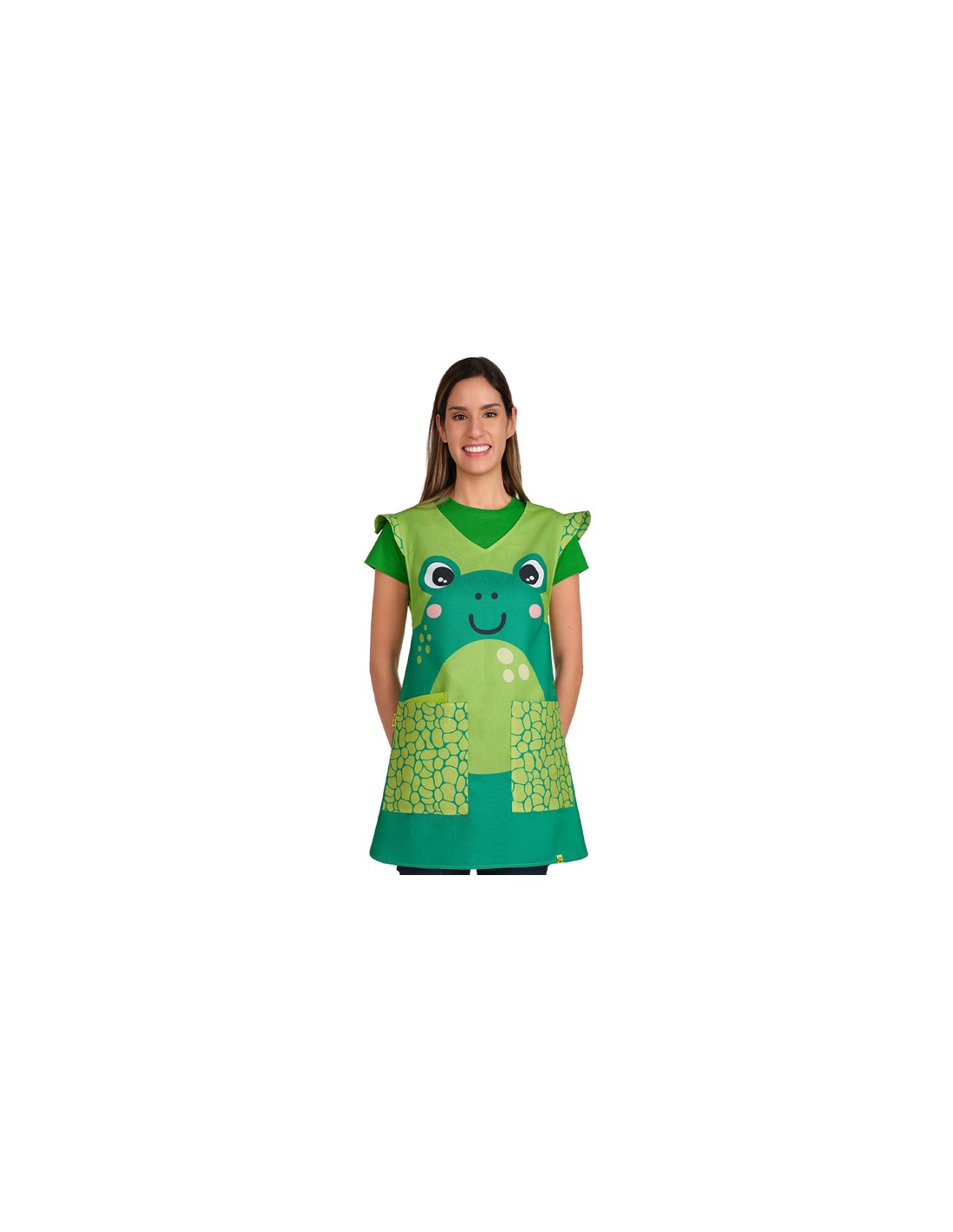 Estola de maestra con divertido estampado de ranita en tonos verdes. Presenta pinzas en la espalda y volantes en sisa para un toque original. Ajuste mediante tiras laterales adaptables. Pinzas y presillas de refuerzo en las esquinas.