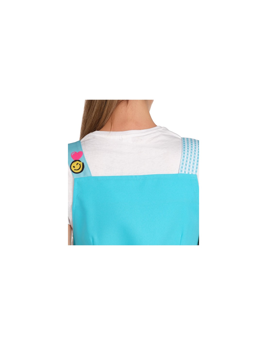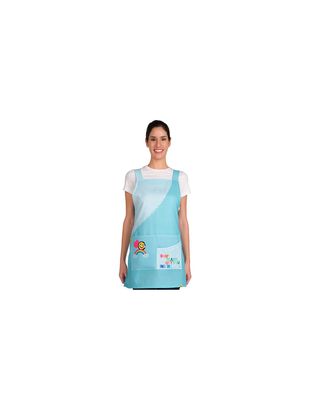 Estola de maestra con estampado de cuadros en tono turquesa y diseño de tirantes asimétricos. Incluye detalle de sonrisa y frase inspiradora “Don't just teach, inspire”. Cuatro bolsillos delanteros, uno de ellos con compartimento interior. Tirantes fijos y tiras laterales para ajustar. Pinzas en la espalda y presillas de refuerzo en bolsillos y atadores.