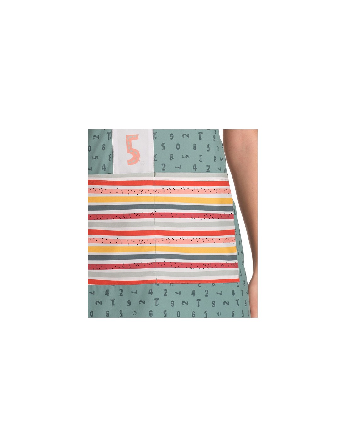 Estola de maestra con estampado frontal de números de colores y detalle de rayas en tirantes y bolsillos. Diseño con tres bolsillos, tirantes fijos y tiras laterales para ajustar. Pinzas en la espalda y presillas de refuerzo en las esquinas de los bolsillos y cintas.