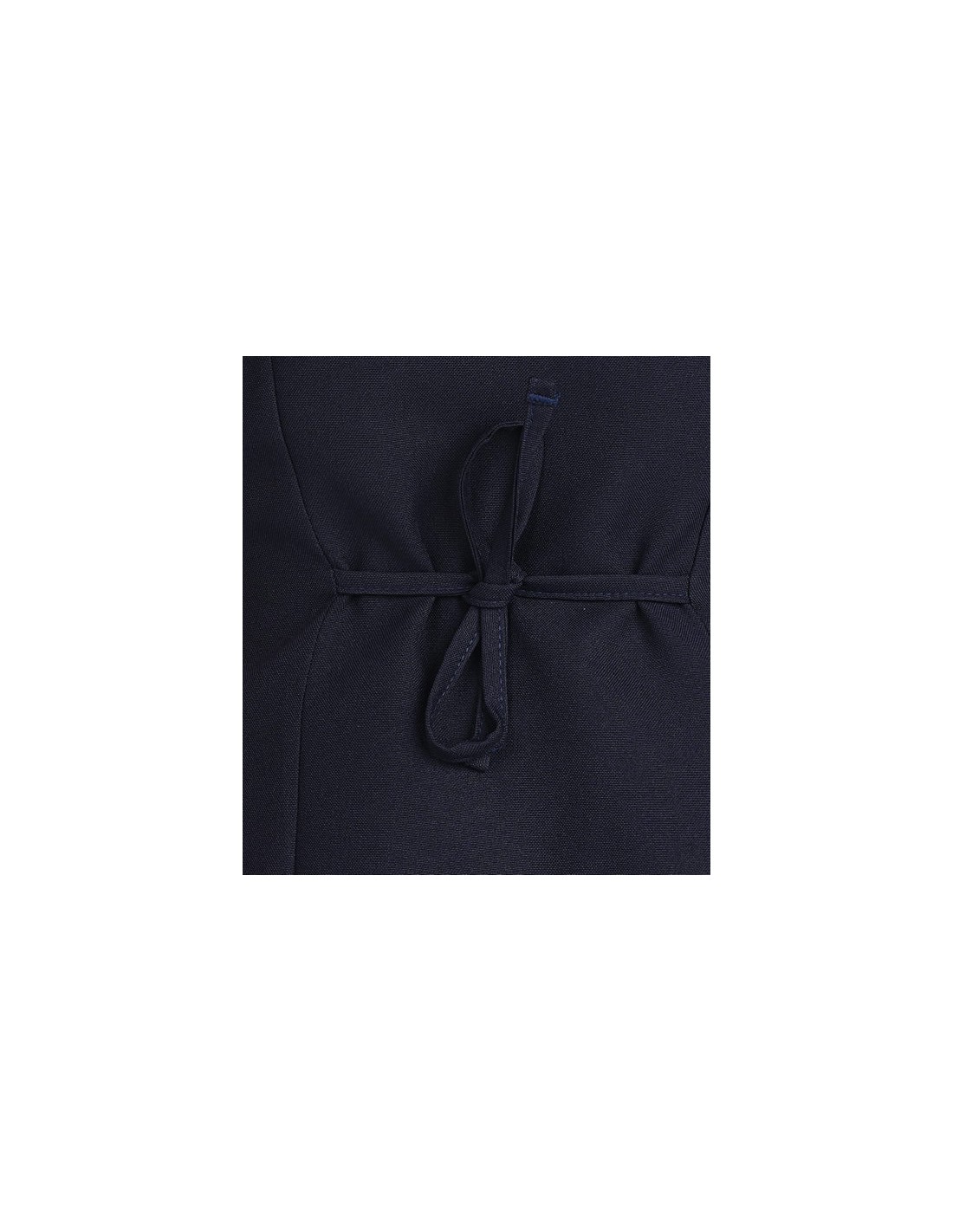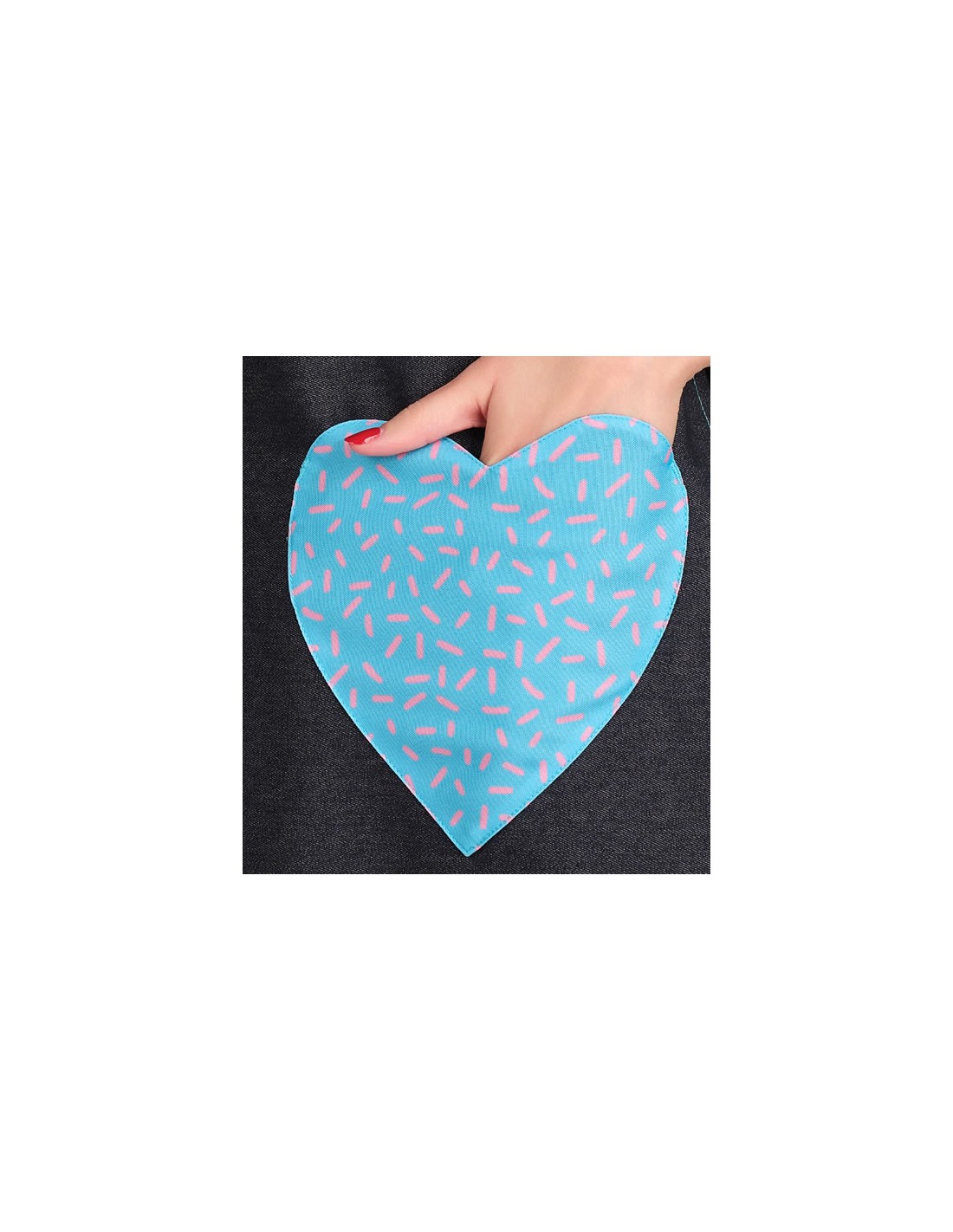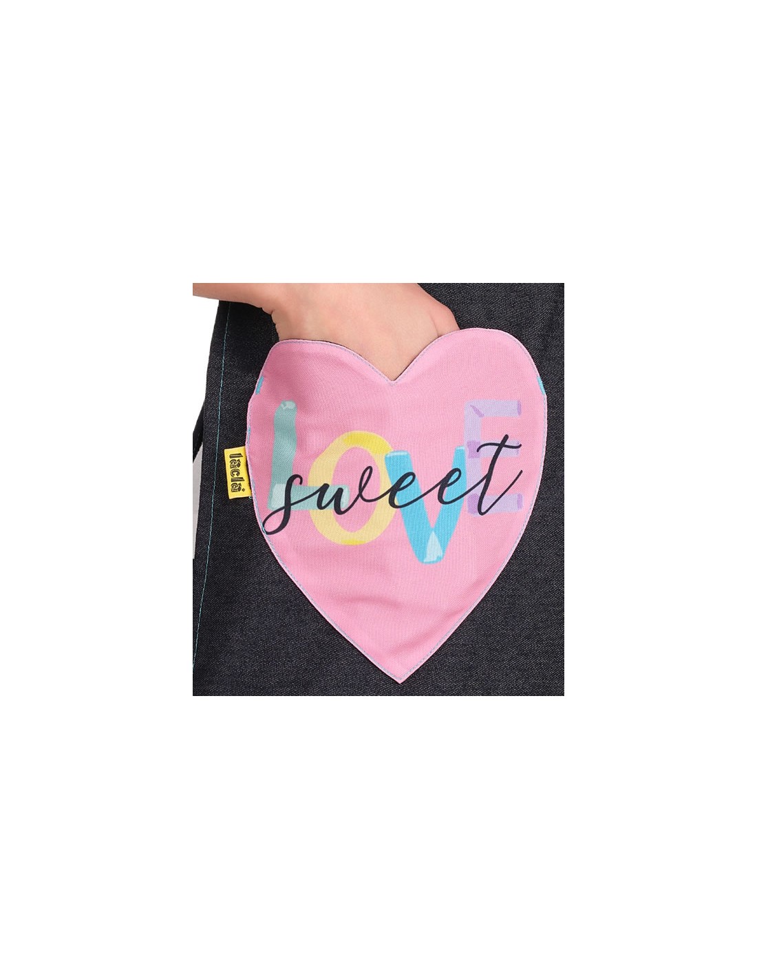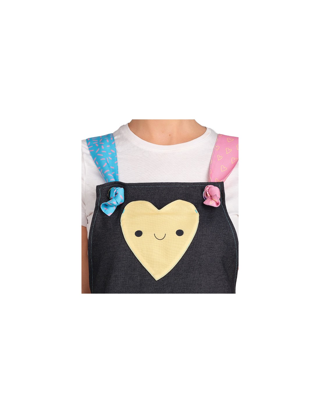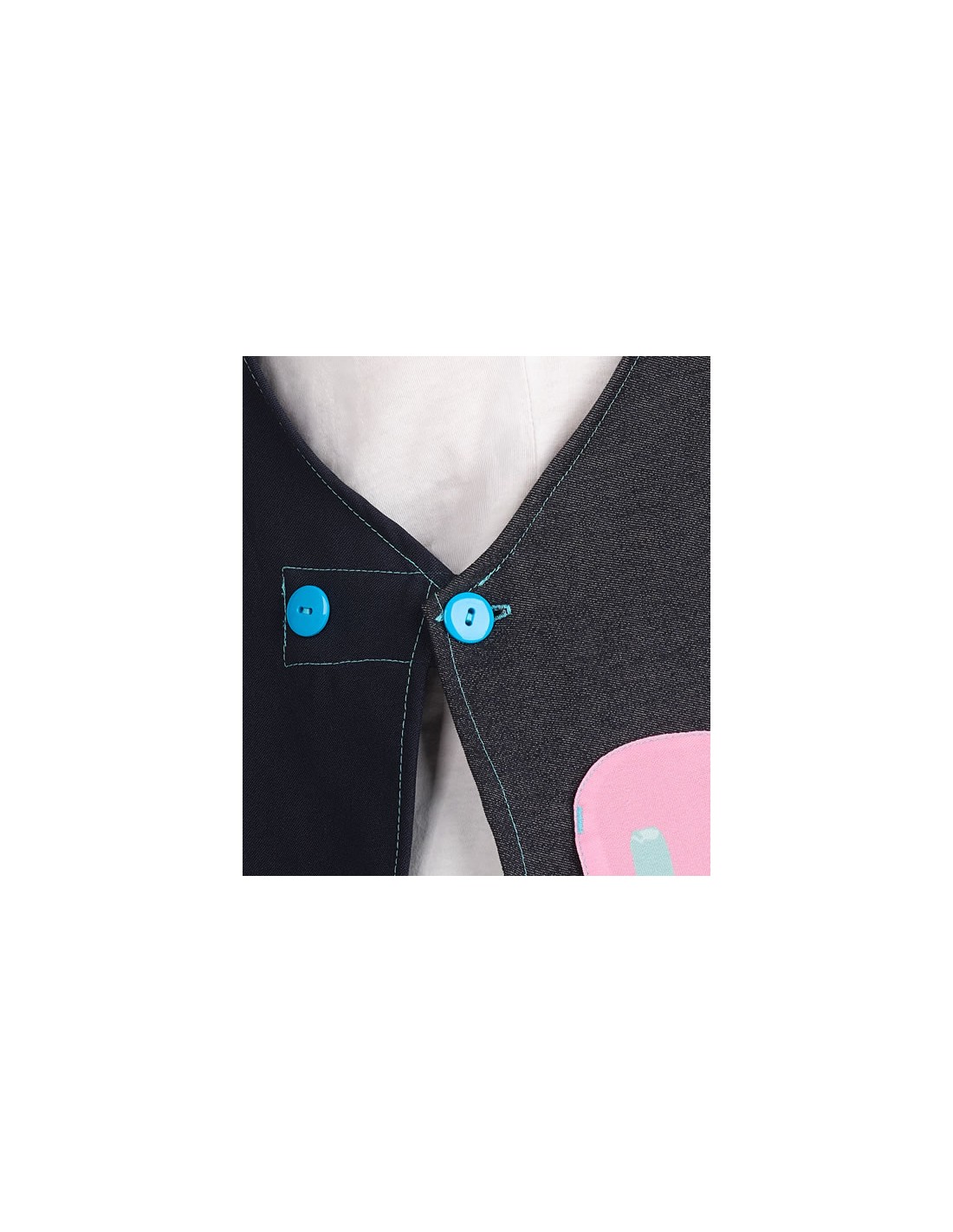 Estola de maestra en color azul marino efecto denim con tres originales bolsillos en forma de corazón y de diferente tamaño. Tirantes en contraste y detalle con nudo ajustable. Cierre lateral mediante botones ajustables para no limitar el movimiento y tiras en espalda para realzar la figura. Presillas de refuerzo en bolsillos y tiras.