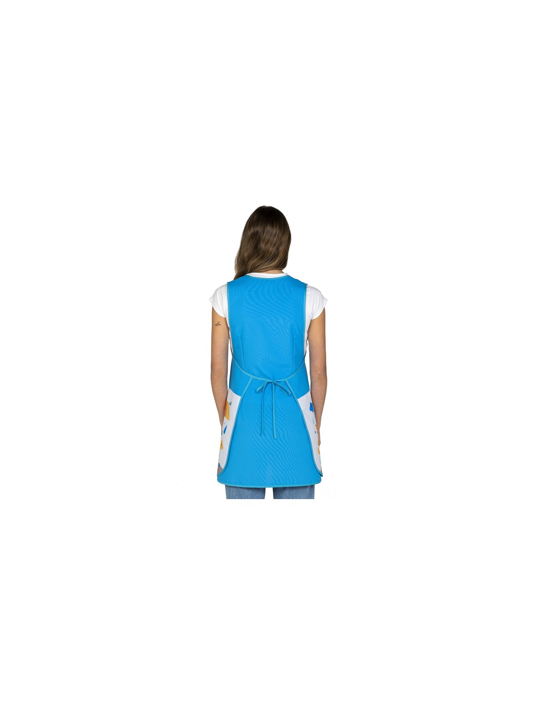 Estola de maestra en color azul combinada con divertido estampado de gatitos con paraguas en el bolsillo tipo falda. Diseño con cuello redondo y amplio bolsillo delantero. Multi talla ajustable mediante cintas para adaptarse cómodamente a todas las siluetas. Largo: 84cm.