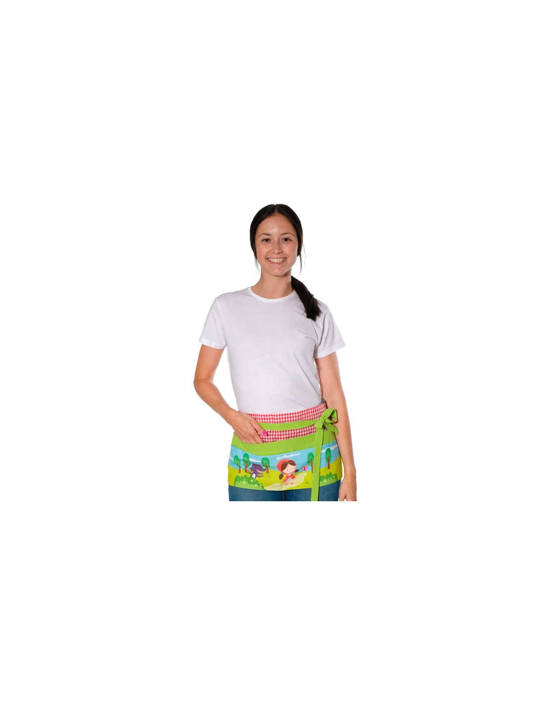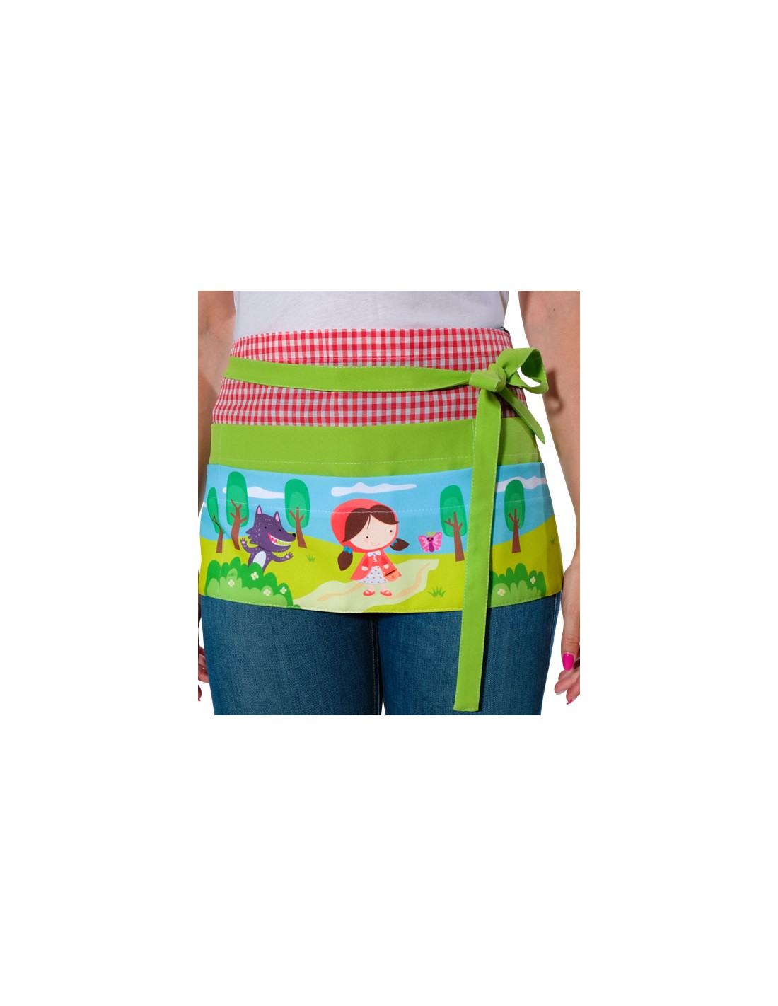 Delantal organizador para maestra de color pistacho con estampado de caperucita roja y el lobo. Delantal corto con seis bolsillos, se ajusta con cintas, se puede anudar en la espalda, delante o en el lateral. Multi talla ajustable. Tejido suave y agradable al tacto.