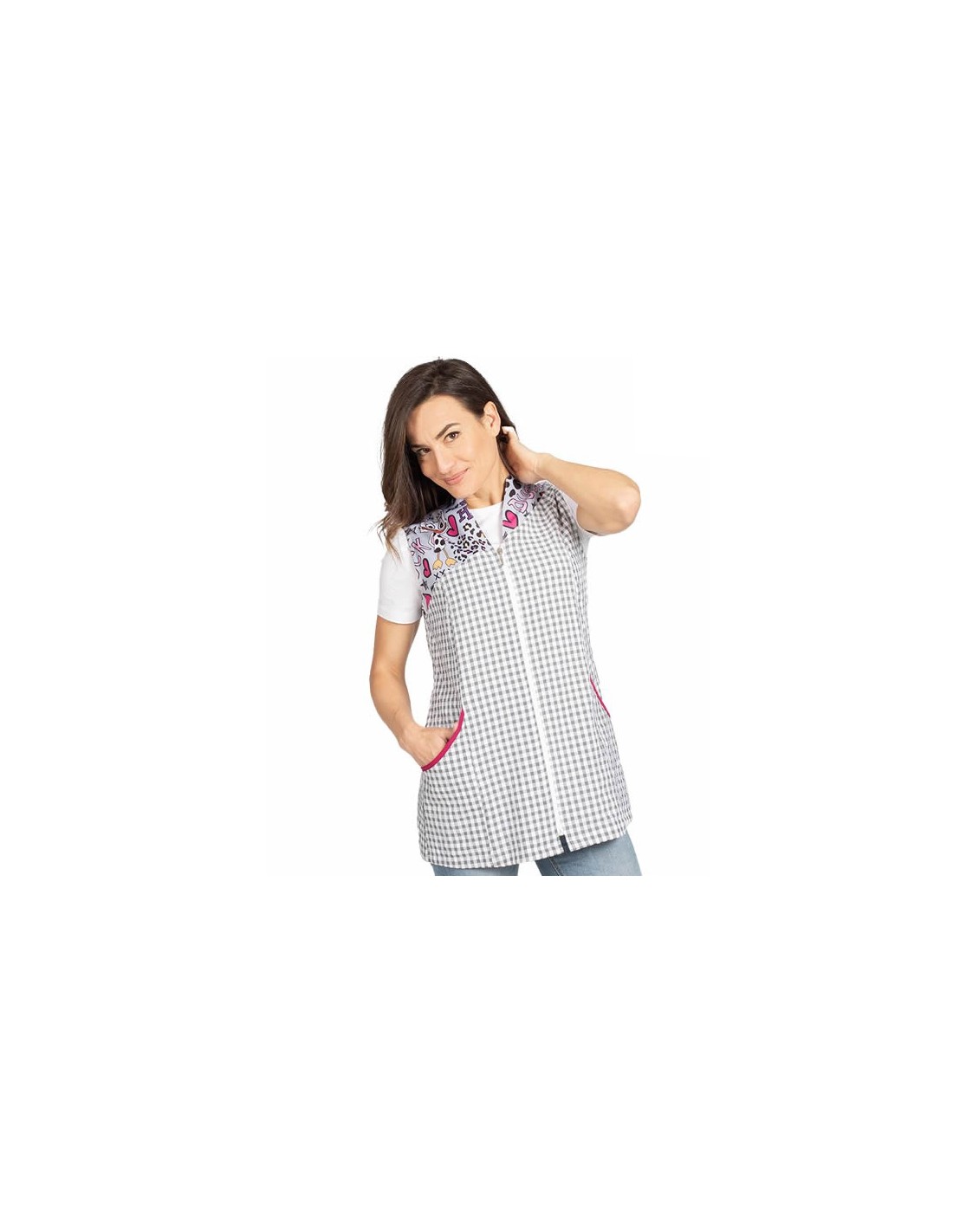 Blusa sin mangas de maestra vichy gris con estampado de patito junto a fantasía en pechera. Cierre mediante cremallera central de doble carro. Dos amplios bolsillos laterales. Pinzas en pecho y espalda para mayor ajuste. Largo aproximado 75cm. Disponible desde la talla XS a la talla XXL