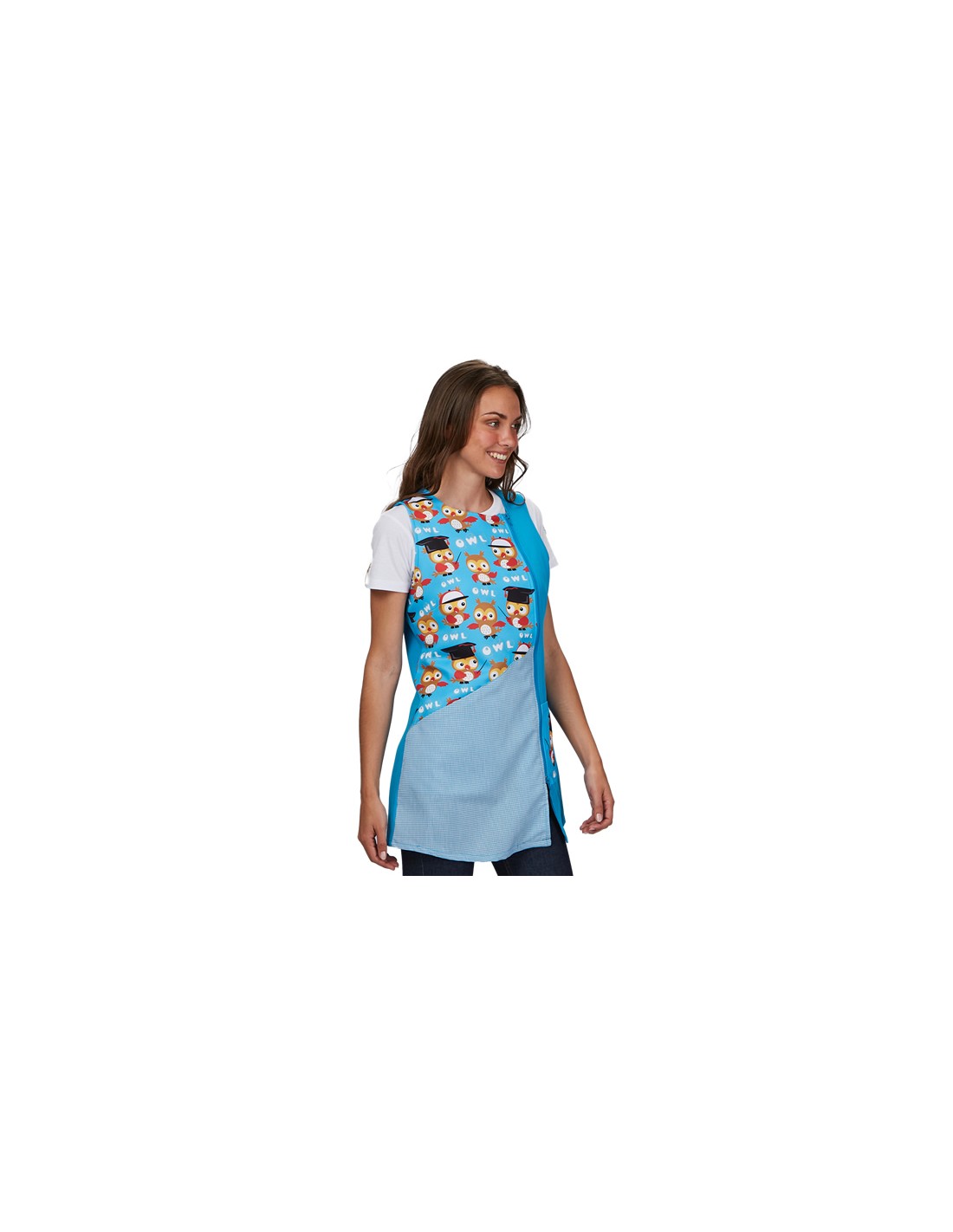 No se olvide de guardar su personalización antes de añadir a la cestaBata sin mangas maestra azul turquesa con estampado de graciosos búhos en pechera. Falda derecha combinada en tejido vichy. Cierre lateral mediante cremallera de doble carro. Pinzas en sisa y espalda para mayor ajuste. Bolsillo en lateral izquierdo con búho graduado estampado.