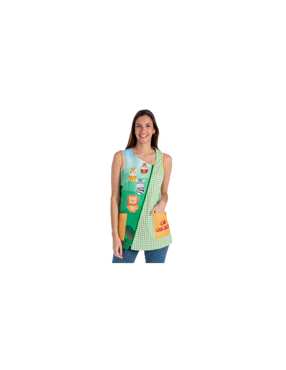 Bata para maestra corta sin mangas confeccionada con tejido vichy de color verde combinado con estampado de animales salvajes en zona pechera derecha. Dos amplios bolsillos. Cierre asimétrico mediante cremallera. Bies y bolsillos de de color ocre a contraste. Pinzas en pecho y espalda. Largo aproximado 69 cm. Disponible desde la talla XS a la talla 3XL.