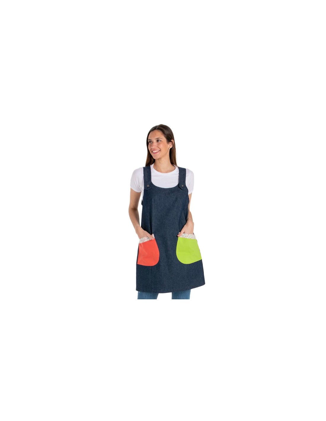 Pichi tejano para maestra con un bolsillo de color coral y otro de color pistacho a contraste. Detalle de bies bolsillos con estampado de florecillas. Cierre mediante botones a presión laterales. Confeccionado con tejido 100% Algodón, de tacto suave y muy resistente. Largo aproximado 84cm. Disponible desde la talla XS a la talla 3XL