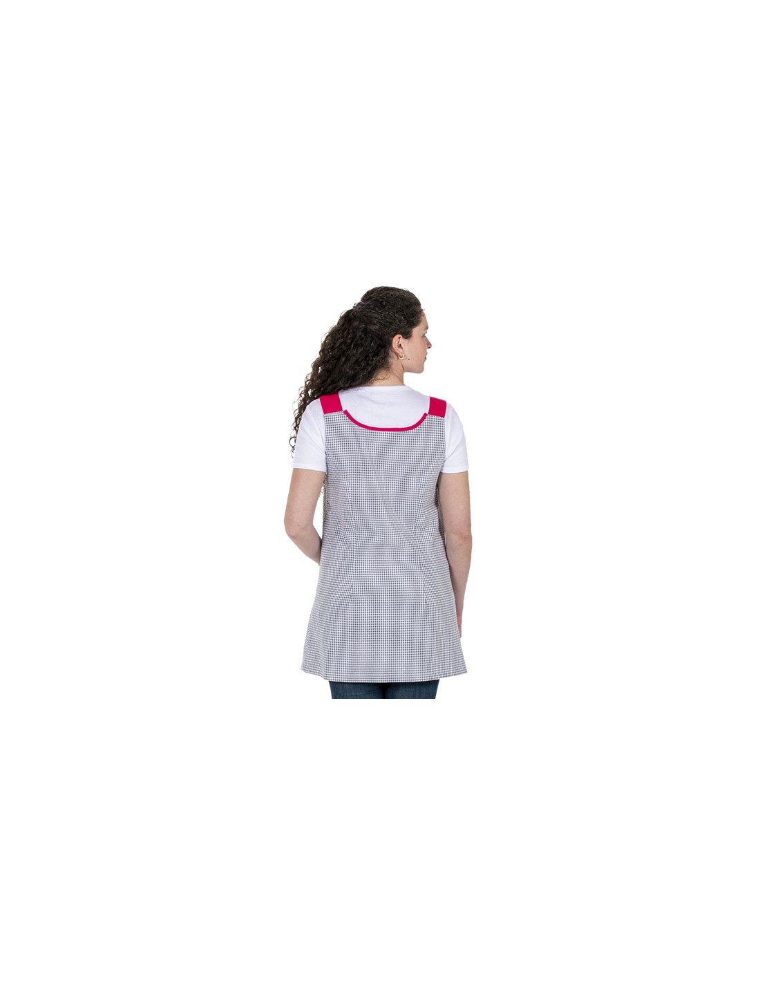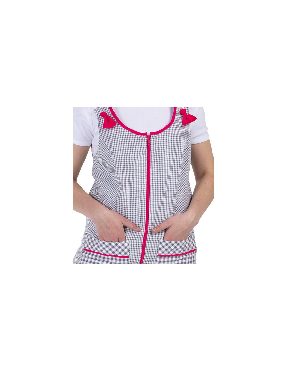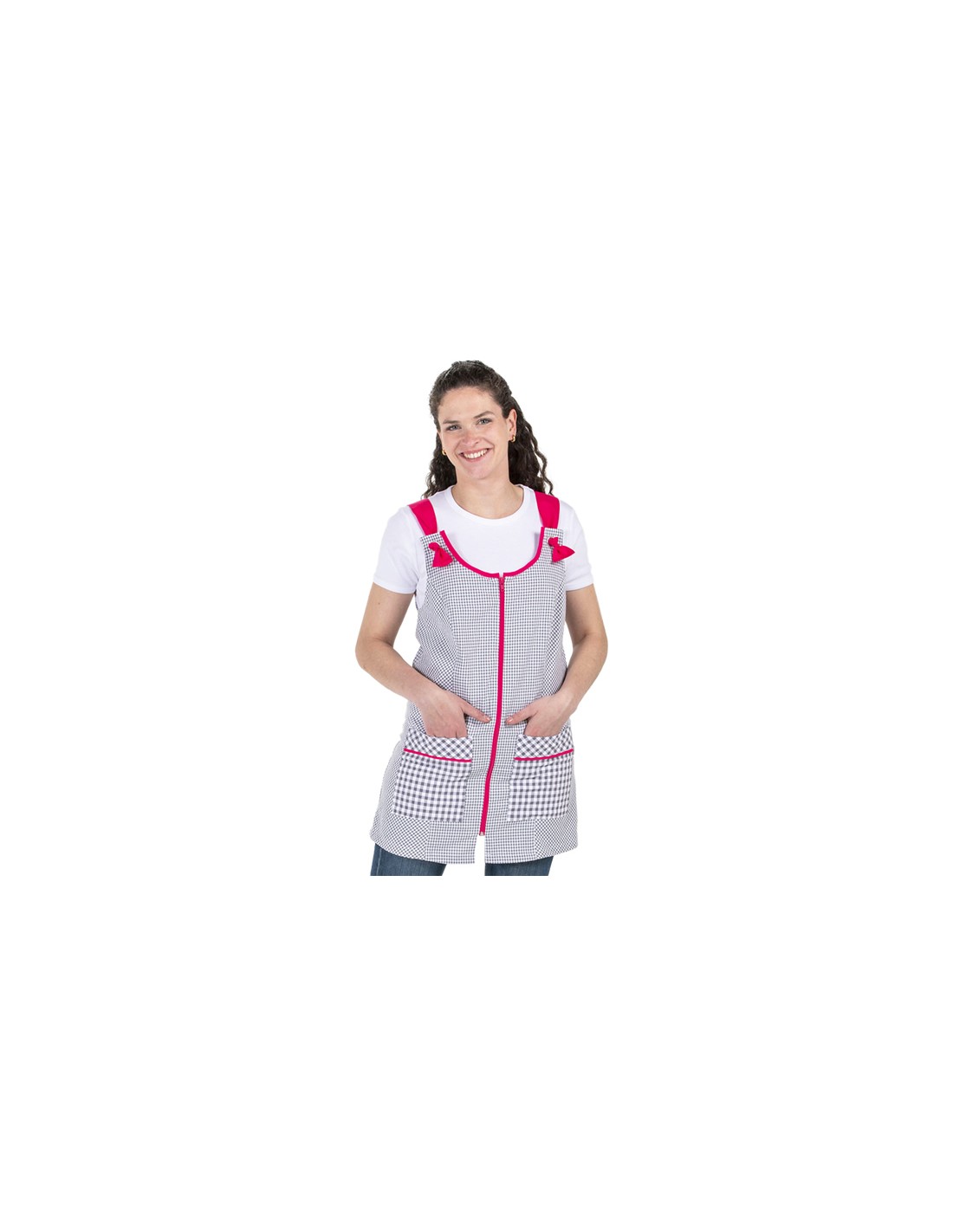 No se olvide de guardar su personalización antes de añadir a la cestaPichi para maestra confeccionado en tejido vichy de color gris combinado con cuadros mas grandes en bolsillos. Cierre mediante cremallera y tirantes regulables con ojal de color fucsia a contraste.