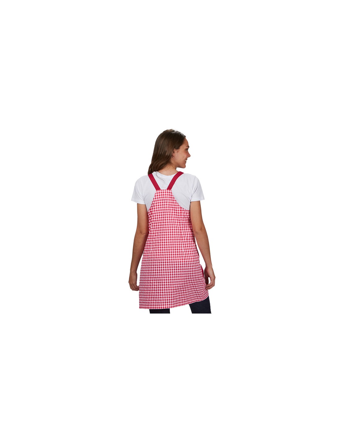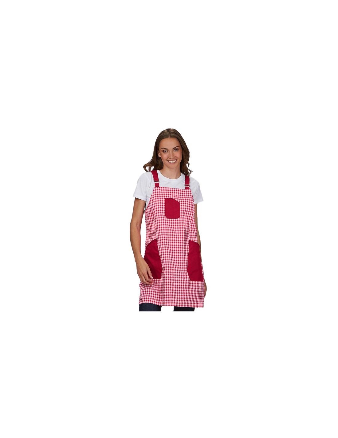 Pichi de maestra confeccionado con tejido Vichy-bambula (60% de algodón orgánico, 20% poliéster reciclado y 20% poliéster) de color fucsia combinado con 3 bolsillos de color morado, dos en la cadera y uno en el peto, tirantes ajustables para mayor comodidad. Cuello cuadrado y cierre mediante cremallera lateral oculta. Disponible desde la talla XS a la talla XXL