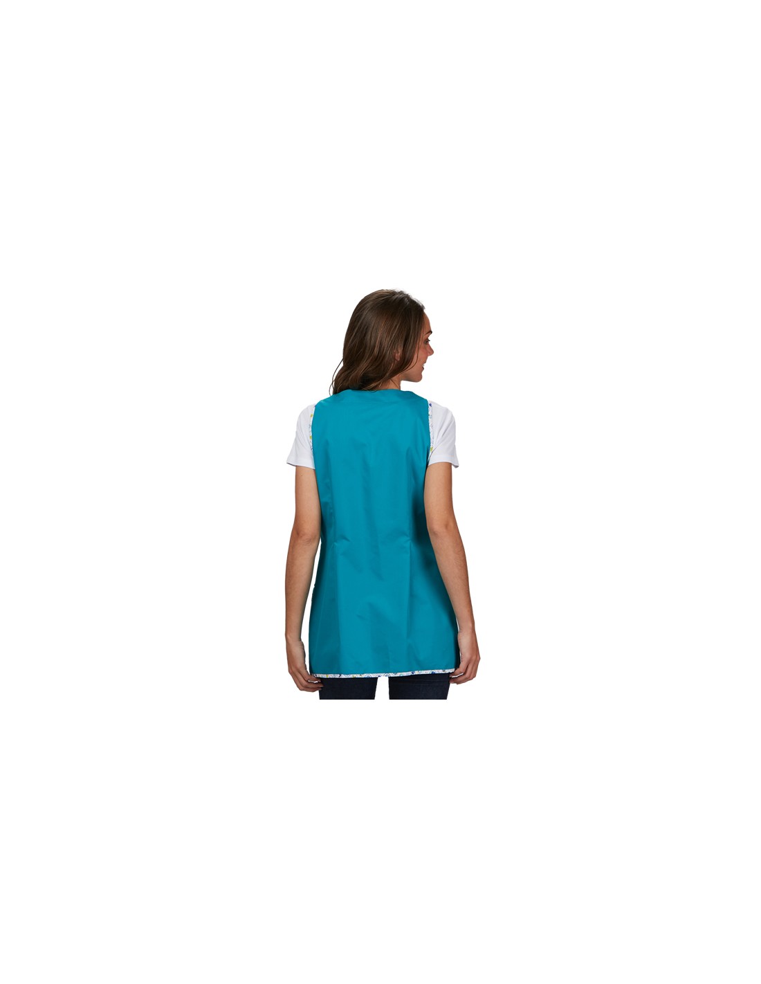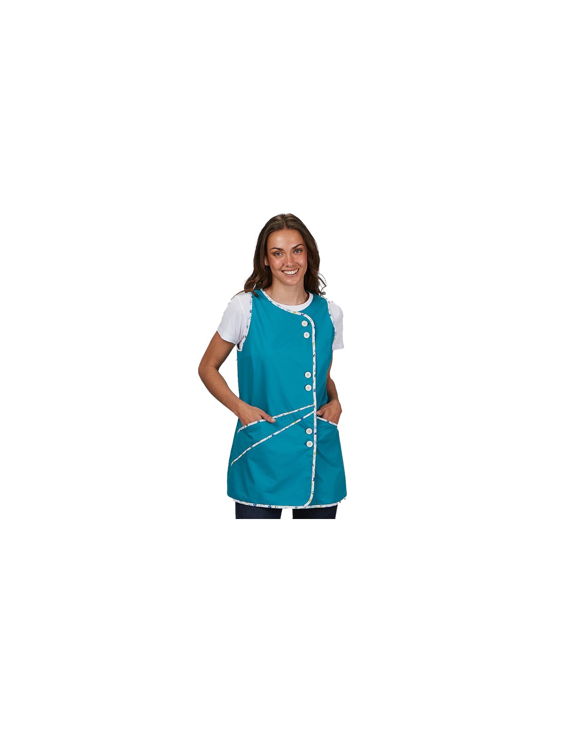 Bata sin mangas de color verde agua confeccionada en tejido loneta con cierre delantero de botones blancos de gran tamaño. Detalle de bies estampado fantasía de colores claros en costuras. Dos bolsillos delanteros de gran capacidad con corte asimétrico. Composición tejido: 43% Poliéster, 32% Poliéster reciclado y 25% Algodón. Cuello redondo y pinzas en pecho y espalda para mayor adaptabilidad. Largo aproximado 75 cm. Disponible desde la talla XS a la talla XXL