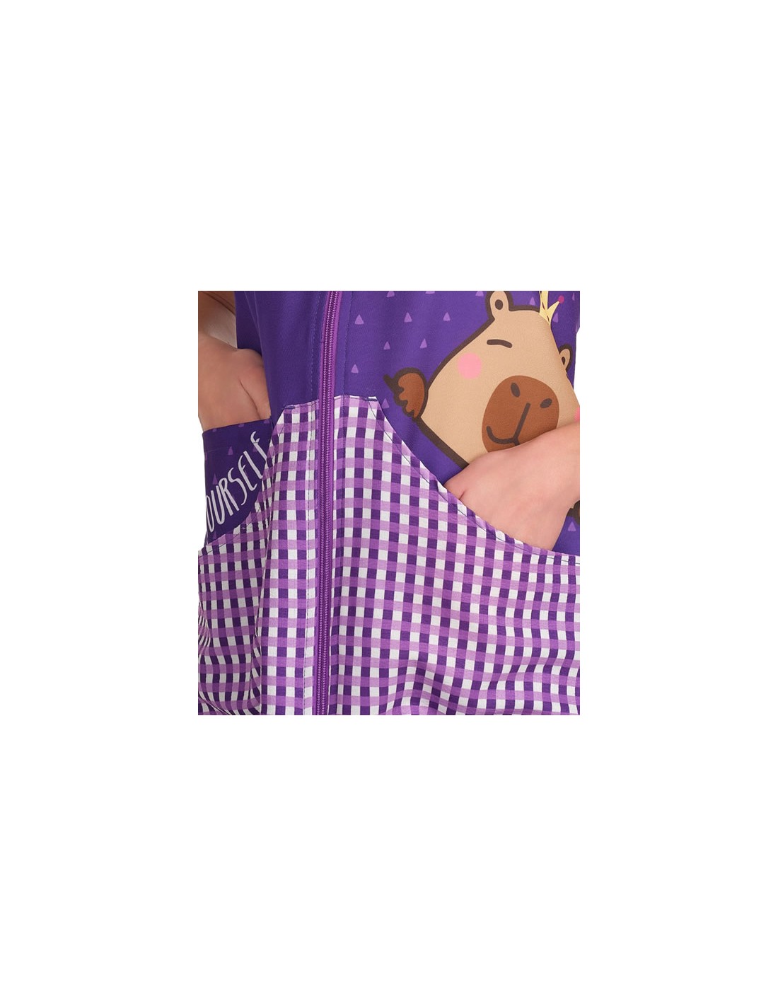 Pichi de maestra en color lila oscuro con estampado frontal de capibara princesa. Tirante derecho con un lazo y cierre central mediante cremallera, incluye además dos bolsillos delanteros grandes y uno interior. Pinza de pecho y pinzas en la espalda con tiras de ajuste. Aberturas laterales y bolsillos con presilla de refuerzo. Disponible desde la talla XS hasta la 3XL.